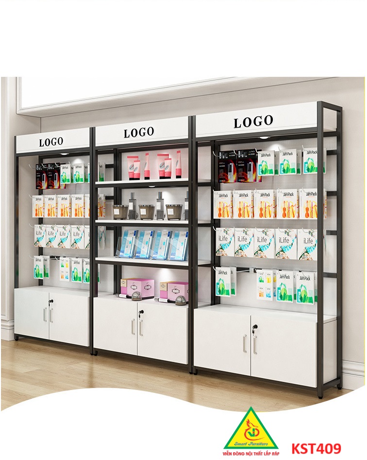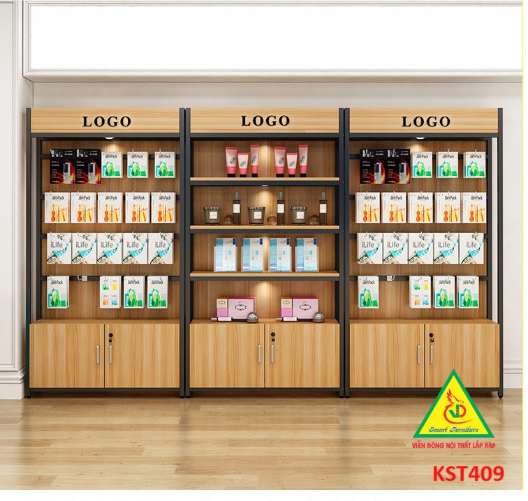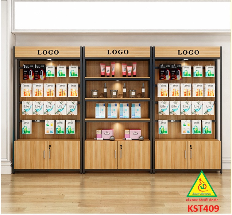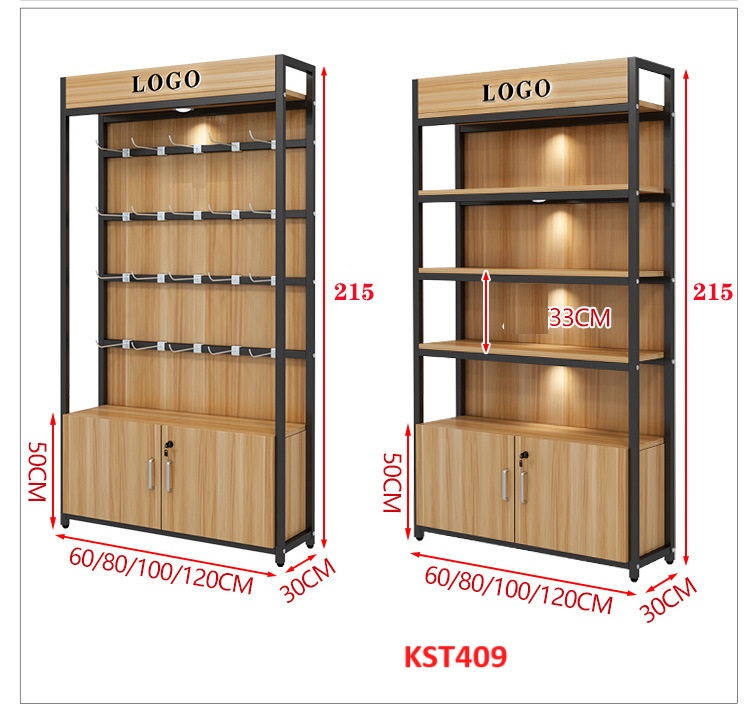 • Kệ gỗ khung sắt có tủ kết hợp hệ thống đèn led làm nỗi bật sản phẩm trưng bày trên kệ.
