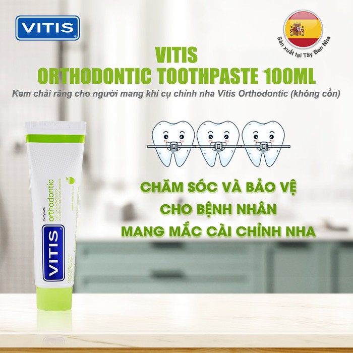 Kem đánh răng cho người chỉnh nha, niềng răng, mang khí cụ chỉnh nha Vitis Orthodontic sử dụng hàng ngày dành cho người đang trong quá trình chỉnh hình bằng mắc cài, người đang đeo khí cụ chỉnh nha với công thức đặc biệt giúp tăng cường và tái khoáng hóa men răng, giảm thiểu sự hình thành mảng bám, làm mềm mảng bám giúp người sử dụng vệ sinh răng miệng được hiệu quả hơn, hạn chế tình trạng lở loét do các dụng cụ chỉnh hình cọ xát với niêm mạc miệng.