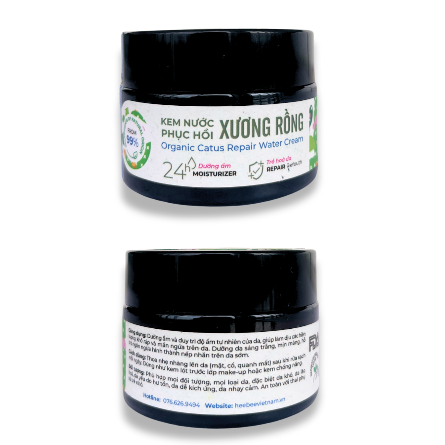 CÔNG DỤNG CỦA KEM DƯỠNG ẨM PHỤC HỒI VÀ TRẺ HOÁ DA CACTUS RECOVERY WATER CREAM MÁT DỊU TỨC THÌ, PHỤC HỒI DIỆU KỲ Với Công nghệ Nano và Trích ly xanh tiên tiến,Kem Dưỡng Ẩm Phục Hồi Và Trẻ Hoá Da được tạo ra với khả năng dưỡng ẩm vượt trội, mang nguồn ẩm len lỏi vào từng lớp tế bào, dưỡng da căng mịn tức thì và duy trì độ mềm mại suốt 24h, đồng thời làm dịu kích ứng nhanh chóng, sửa chữa và phục hồi các tổn thương trên bề mặt da, kể cả các hư tổn lâu năm tạo ra từ quá trình chăm sóc da trước đó, khôi phục hàng rào bảo vệ da chống lại các tác nhân gây lão hóa, đánh thức năng lượng tươi trẻ của làn da, dưỡng da sáng khỏe và săn chắc hơn.   Điểm đột phá của Kem Nước đến từ việc phát triển thành công Chiết xuất Xương Rồng với kỹ thuật siêu âm đến từ đội ngũ nghiên cứu Heebee. Xương rồng vốn là loài cây sở hữu nhiều hoạt chất chống oxy hóa và phục hồi, nhờ vào kỹ thuật trích ly công nghệ cao đã giúp thu hoạch trọn vẹn các hoạt chất thành phần chất lượng như piscidic acid, Những hoạt chất này có khả năng vượt trội trong việc thúc đẩy sự sản sinh collagen tự nhiên và cân bằng độ ẩm làn da, đồng thời tạo sự cân bằng hệ vi sinh duy trì độ ẩm thiết yếu cho làn da, đẩy nhanh quá trình làm lành các tổn thương, tăng khả năng tự bảo vệ của da trước các tác động xấu từ môi trường, sinh lý và tuổi tác, làm chậm quá trình oxy hóa da và ngăn ngừa dấu hiệu lão hóa và dưỡng da mịn màng, đều màu, trẻ trung. Kem Dưỡng Ẩm Phục Hồi Và Trẻ Hoá Da sở hữu nét độc đáo với hệ dưỡng chống lão hóa thực vật từ 2 thành phần thuần Việt đạt chứng nhận hữu cơ EcoCert Cosmo Châu Âu: chiết xuất Xương Rồng và dầu Mù U cùng các loại dầu nuôi dưỡng và các hoạt chất khoa học mang đến khả năng cấp ẩm, dưỡng da trắng đều màu và chống oxy hóa mạnh mẽ: