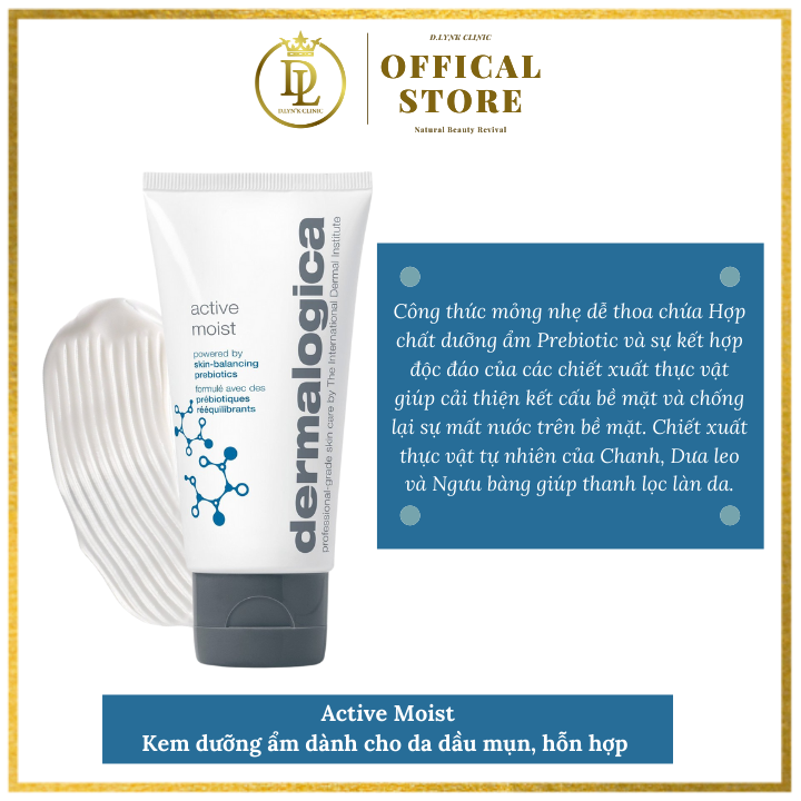 Kem dưỡng da Dermalogica Active Moist 100 ml dành cho da dầu Kem dưỡng ẩm cho da dầu Dermalogica Active Moist có khả năng thẩm thấu nhanh và không để lại cảm giác nhờn rít trên da, giúp cung cấp độ ẩm sâu cho da, làm mịn và cải thiện rõ rệt bề mặt da. Sự kết hợp của thành phần silk amino acid cùng các chiết xuất thảo mộc giúp làm mềm mịn và khôi phục khả năng tự bảo vệ da. Ngoài ra, chiết xuất cải xoong, ngưu bàng, thường xuân… giúp tái tạo và cung cấp độ ẩm sâu cho da. Đặc biệt, sản phẩm kem dưỡng ẩm này không chứa màu và hương liệu nhân tạo nên đảm bảo an toàn cho da. Đây cũng là sản phẩm được khuyên dùng bởi các chuyên gia. THÔNG TIN SẢN PHẨM