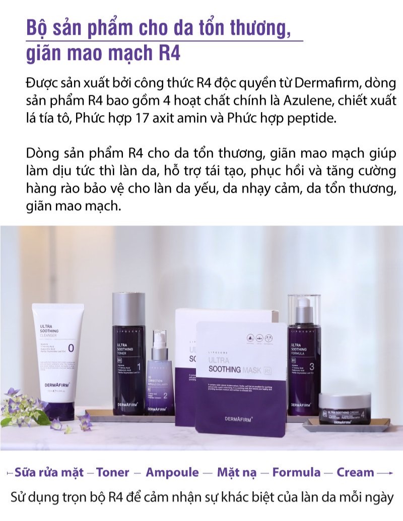 - Đẩy nhanh thời gian phục hồi cho làn da với công thức R4 độc quyền (Azulene: tái tạo và làm dịu/ Chiết xuất lá tía tô: chống oxy hóa, phục hồi và trẻ hóa làn da/ Phức hợp 17 Amino Acid: tăng độ đàn hồi và dưỡng ẩm/ Phức hợp Peptide: kích hoạt sự trao đổi chất của tế bào).