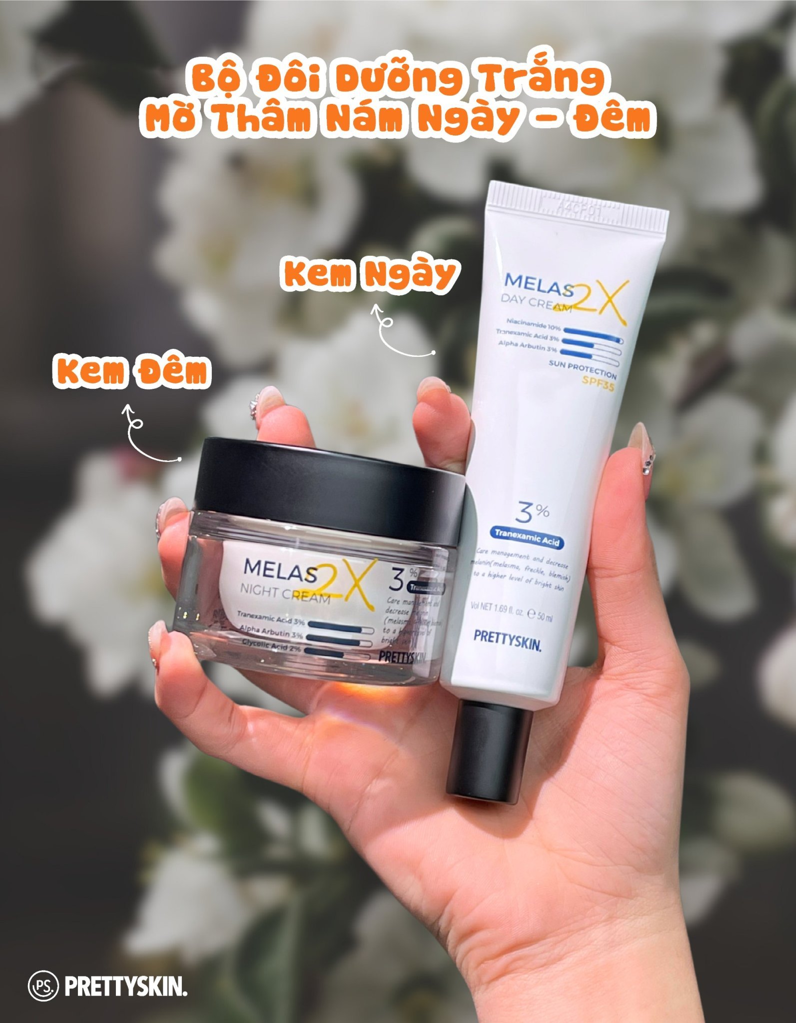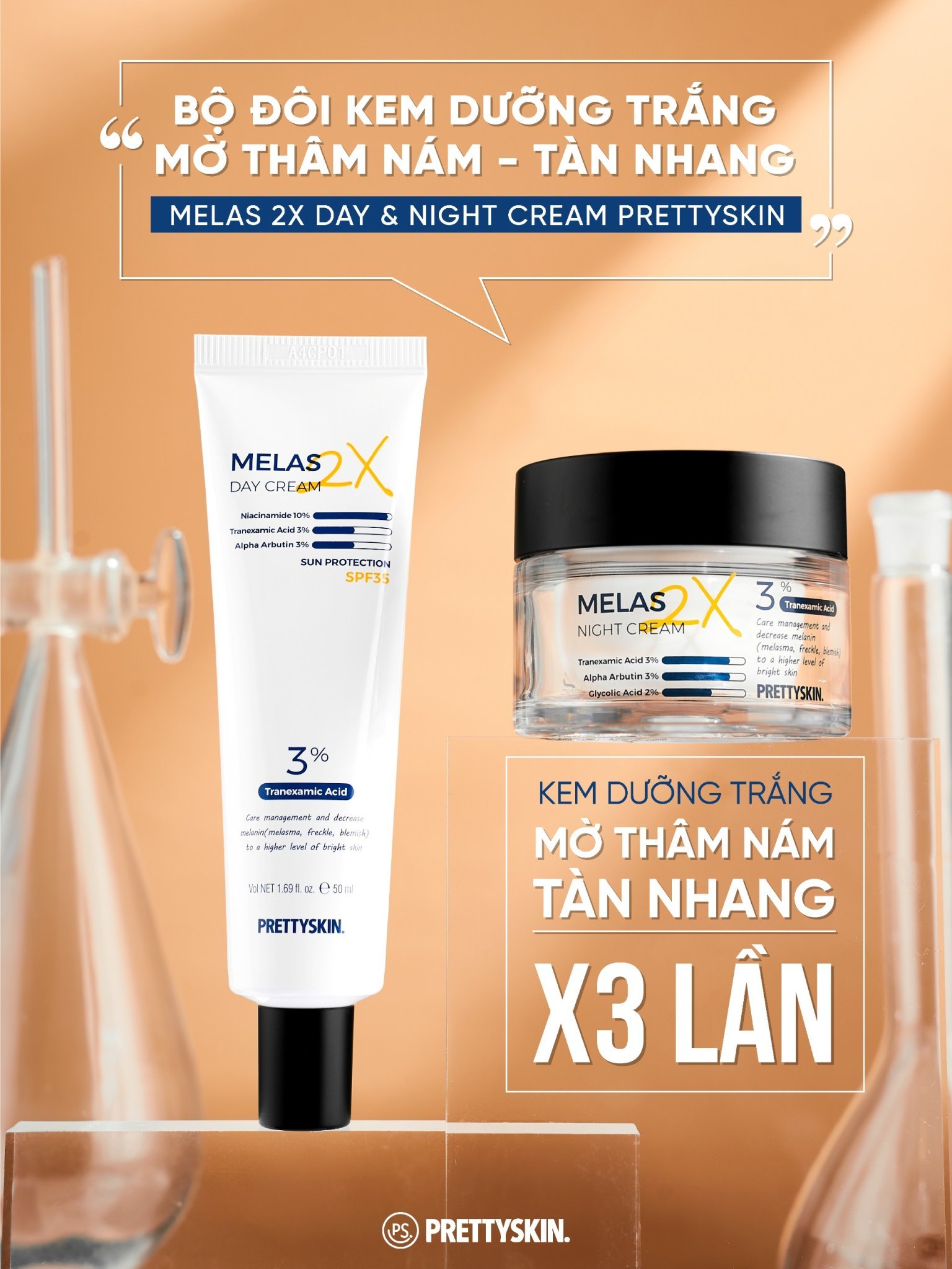Sự kết hợp của 3% cùng với 3% là điểm nhấn ấn tượng có trong bộ đôi kem dưỡng ngày đêm Melas 2X mới nhà Prettyskin mang lại hiệu quả làm sáng da và làm mờ các vết thâm nám.