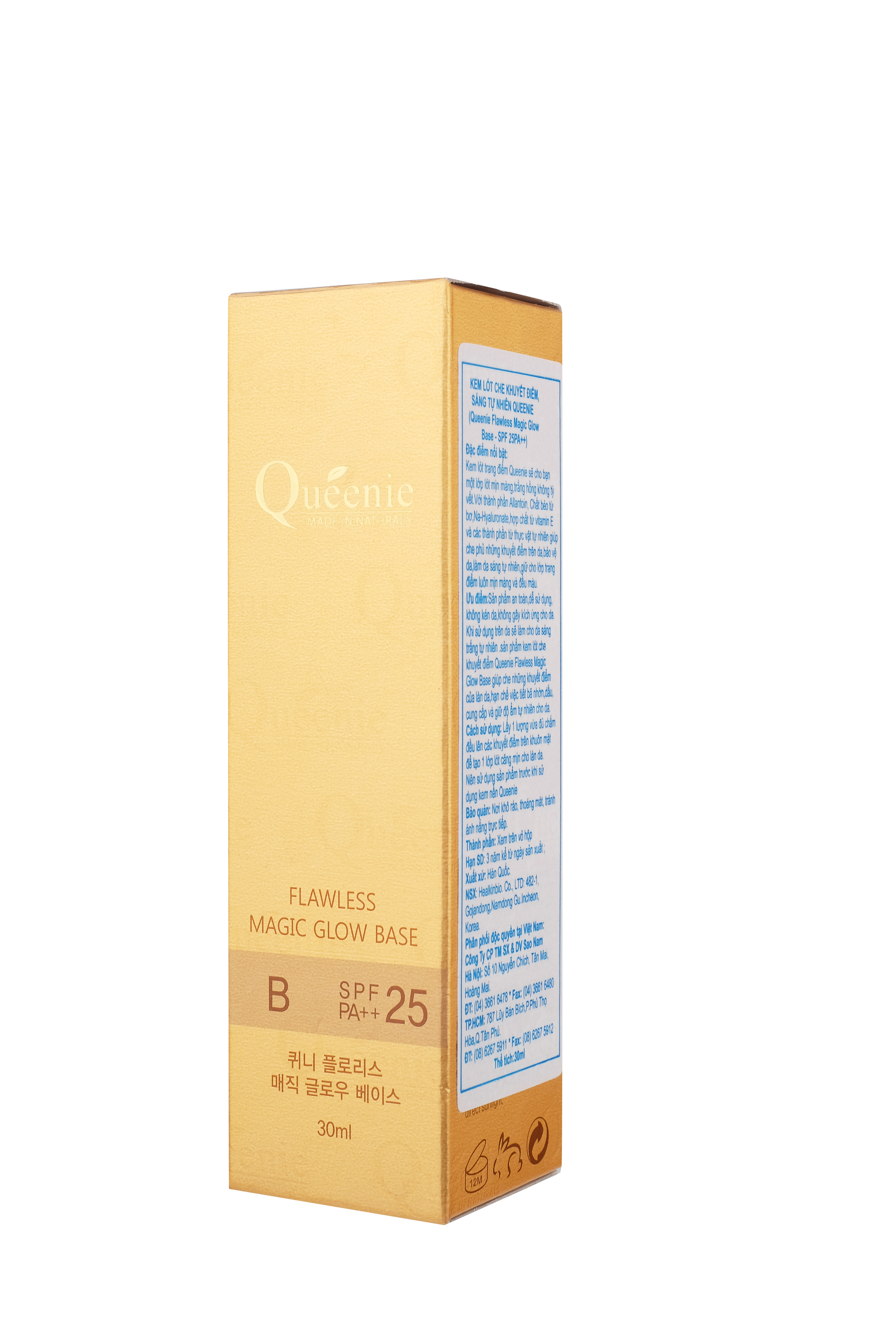 Việc khổ sở nhất của làn da dầu mỗi khi trang điểm chính là da bị đổ dầu nhiều, lỗ chân lông to khiến cho lớp nền nhanh bị xuống tông, kém mịn màng. Sử dụng kem lót là bước không thể thiếu để sở hữu lớp trang điểm bền màu, đẹp hoàn hảo. Vì vậy, loại kem lót có khả năng kiềm dầu và se khít lỗ chân lông là lựa chọn tối ưu nhất. Kem lót trang điểm Queenie Flawless Magic Glow Base SPF 25 PA++ sẽ cho bạn một lớp lót mịn màng. Với thành phần Allantoin, tinh dầu bơ, Na-Hyaluronate, hợp chất từ vitamin E và các thành phần từ thực vật cung cấp độ ẩm tự nhiên cho da, bảo vệ da được an toàn trước các tia UV có hại, giúp che phủ những khuyết điểm trên da, hạn chế việc tiết bã nhờn, giữ cho lớp trang điểm luôn mịn màng và đều màu.