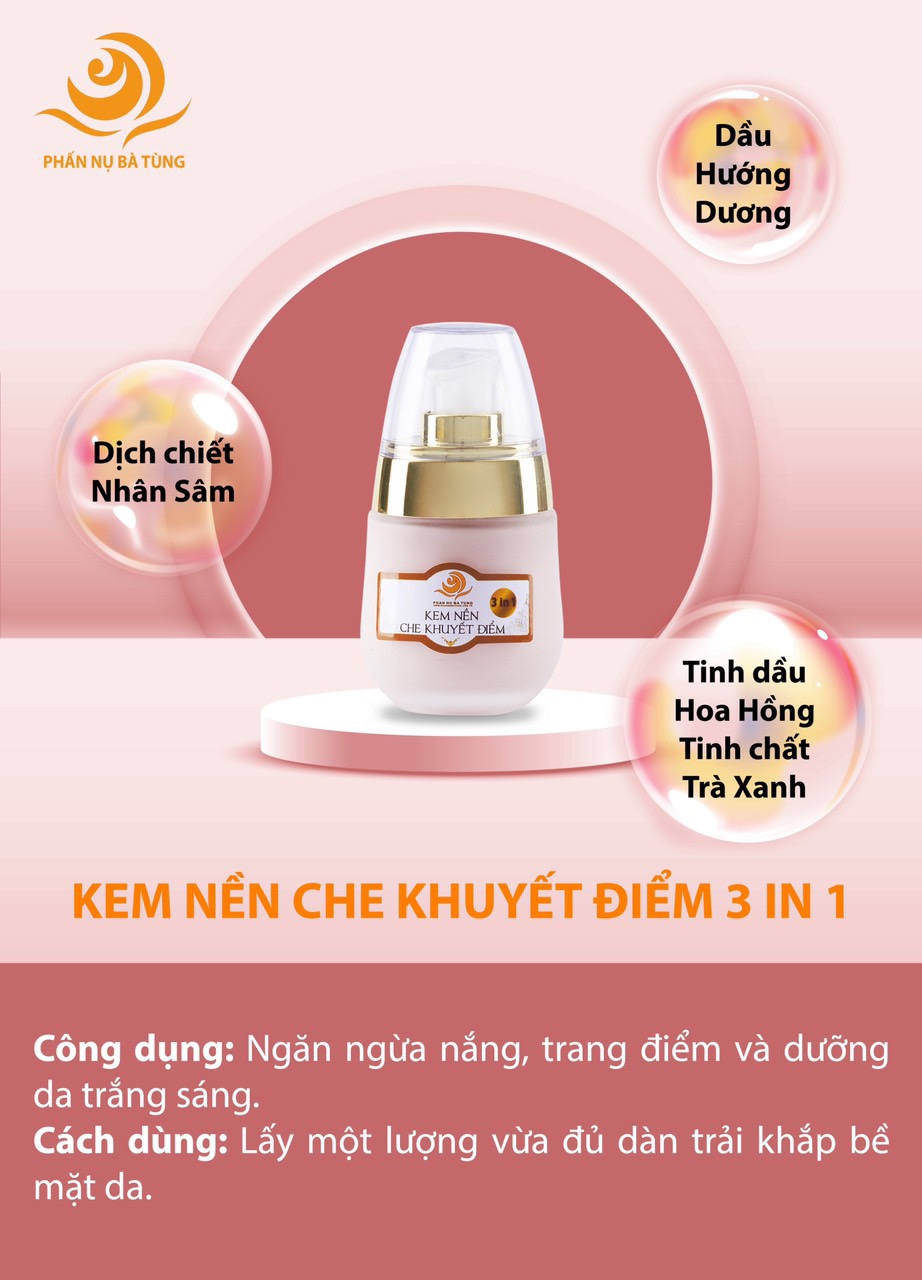 Công dụng: Đây là sản phẩm vượt trội với ba công dụng: ngăn ngừa nắng, trang điểm vàdưỡng da trắng sáng. Có tác dụng tạo lớp nền che phủ tự nhiên mỏng mịn, tăng độ đàn hồi da, giảm thiểu nếp nhăn và lỗ chân lông giúp da mịn màng, trắng sáng. Với kết cấu hạt nhỏ siêu mịn che đi những khuyết điểm trên da, tạo cho bạn một làn da hoàn hảo. Cách dung Lấy một lượng vừa đủ dàn trải khắp bề mặt da. Thành phần Sáp ong, Dầu hướng dương, Dịch chiết Nhân sâm, Tinh chất trà xanh,Tinh dầu hoa hồng, Nước tinh khiết. Bảo quản Nơi khô ráo và thoáng mát.Tránh ánh nắng trực tiếp và nhiệt độ cao. HD: 2 năm kể từ ngày sản xuất.