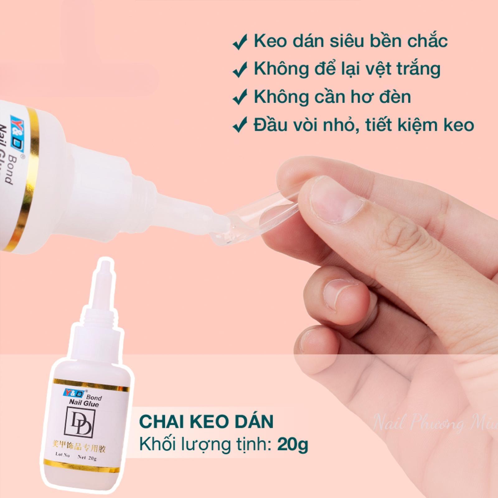 - Hướng dẫn sử dụng (cách đính đá, charm, phụ kiện):Bước 1: Dũa dày mài nhám phần móng bạn muốn đính đá, charm. Sau đó, trải một lượng keo DD vừa đủ lên toàn bộ bề mặt móng tay bạn muốn đính phụ kiện. Đặt phụ kiện trang trí lên phần đã trải gel rồi ấn chặt xuống.Bước 2: Sau khi xếp đặt các mẫu trang trí theo design, bạn dùng chai dung dịch khô keo chải đều vào các phần chân của đá, phụ kiện, charm. Phần keo đính đá sẽ khô ngay lập tức.