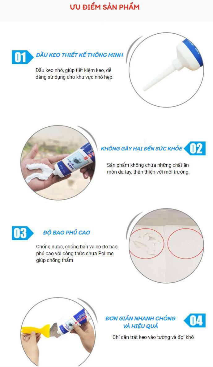 Dính cực kỳ chắc, chịu nước, chống thấm hoàn hảo,giải quyết tất cả các khó khăn cho gia đình bạn một cách nhanh chóng