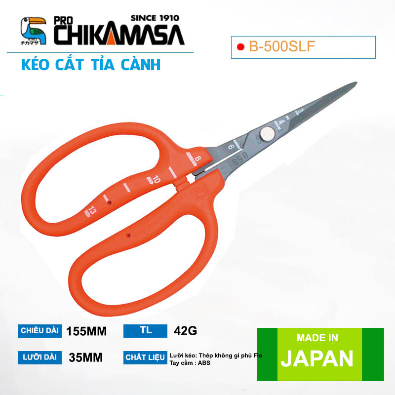 - Nét đẹp và độ tỉ mỉ của kéo cắt nho Nhật Bản Kéo cắt nho Chikamasa là bộ sưu tập thú vị cho chị em thích những chiếc kéo xinh xắn và có độ bén cao. Chikamasa B-500SLF là loại kéo dài nhỏ được làm bằng thép không gỉ phủ Flo, lưỡi cắt đi qua nhau như kéo cắt giấy quen thuộc. Mặt cắt phẳng phiu được mài bằng kỹ thuật tiên tiến cho độ sắc ấn tượng, cắt bén ngọt, sạch sẽ cành hoa, nhánh lá và hoa trái. Tay cầm ABS trên dưới làm rộng và đều nhau xỏ vừa các ngón tay và giúp chị em giữ kéo ngay ngắn. Ngoài ra, dòng kéo này có thiết kế phần lưỡi cong chữ L cực kỳ chuyên dụng. Được chế tạo theo kỹ thuật người Nhật, kéo cắt nho Chikamasa thống nhất và khớp tuyệt đối giữa tay cầm và lưỡi cắt. Khi cầm nắm không có cảm giác lỏng lẻo hay tiếng rít ở chỗ tiếp xúc, nhờ đó thao tác cắt tỉa rất êm ái nhẹ nhàng. Lưỡi cắt chống gỉ sét tuyệt đối cùng tay cầm cứng cáp, vừa vặn với đôi bàn tay xinh xắn bé nhỏ của chị em phụ nữ. Đặc biệt dòng sản phẩm này có thiết kế thêm vạch đo giúp bạn ước lượng được kích cỡ chùm nho nhanh chóng.
