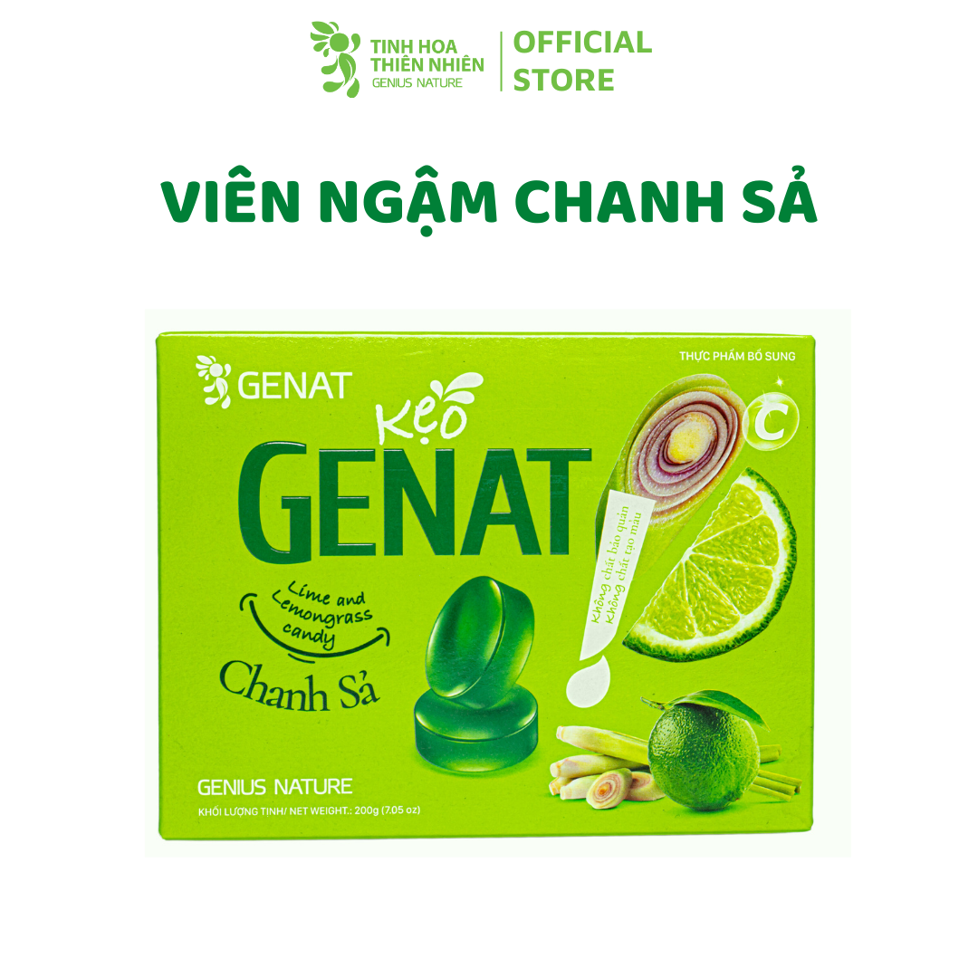 Kẹo ngậm Chanh Sả (Hủ 300 viên) - Genat -Tinh Hoa Thiên Nhiên Thành phần: Đường, Mạch nha, nước, dịch chiết củ Sả 10%, nước Chanh muối 1500 mg/kg, tinh dầu Chanh 400 mg/kg, tinh