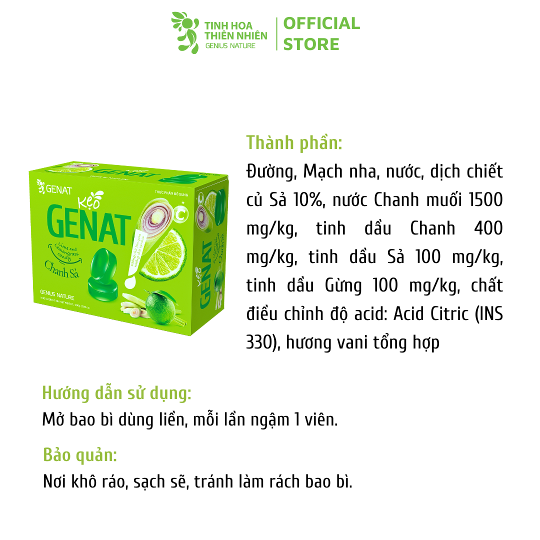 Kẹo ngậm Chanh Sả (Hủ 300 viên) - Genat -Tinh Hoa Thiên Nhiên Thành phần: Đường, Mạch nha, nước, dịch chiết củ Sả 10%, nước Chanh muối 1500 mg/kg, tinh dầu Chanh 400 mg/kg, tinh