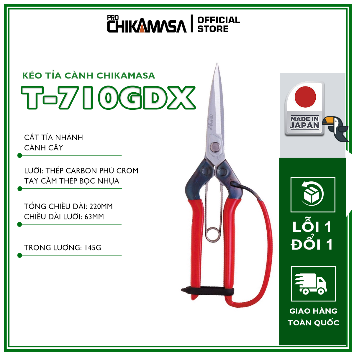 Mua tại TiktokChikamasa T-710GDX là mẫu kéo tỉa cành đơn giản và gọn gàng nhất dùng để cắt cành lá nhỏ, tỉa tót chậu hoa, bụi kiểng. Kiểu dáng trước sau thon thả với tay cầm nhỏ nhắn làm từ thép phủ chất chống trượt, cùng lò xo trợ lực tạo cảm giác bóp nhẹ nhàng. Bạn sẽ không thấy mỏi tay hay trơn tuột cả khi cắt tỉa thường xuyên, có thể thao tác thuận tiện hai tay. Tổng chiều dài: 220mm. Chiều dài lưỡi: 63mm Trọng lượng: 145g Lưỡi: thép carbon chất lượng cao.. Chất liệu tay cầm: thép phủ chất chống trượt. Xuất xứ: Japan