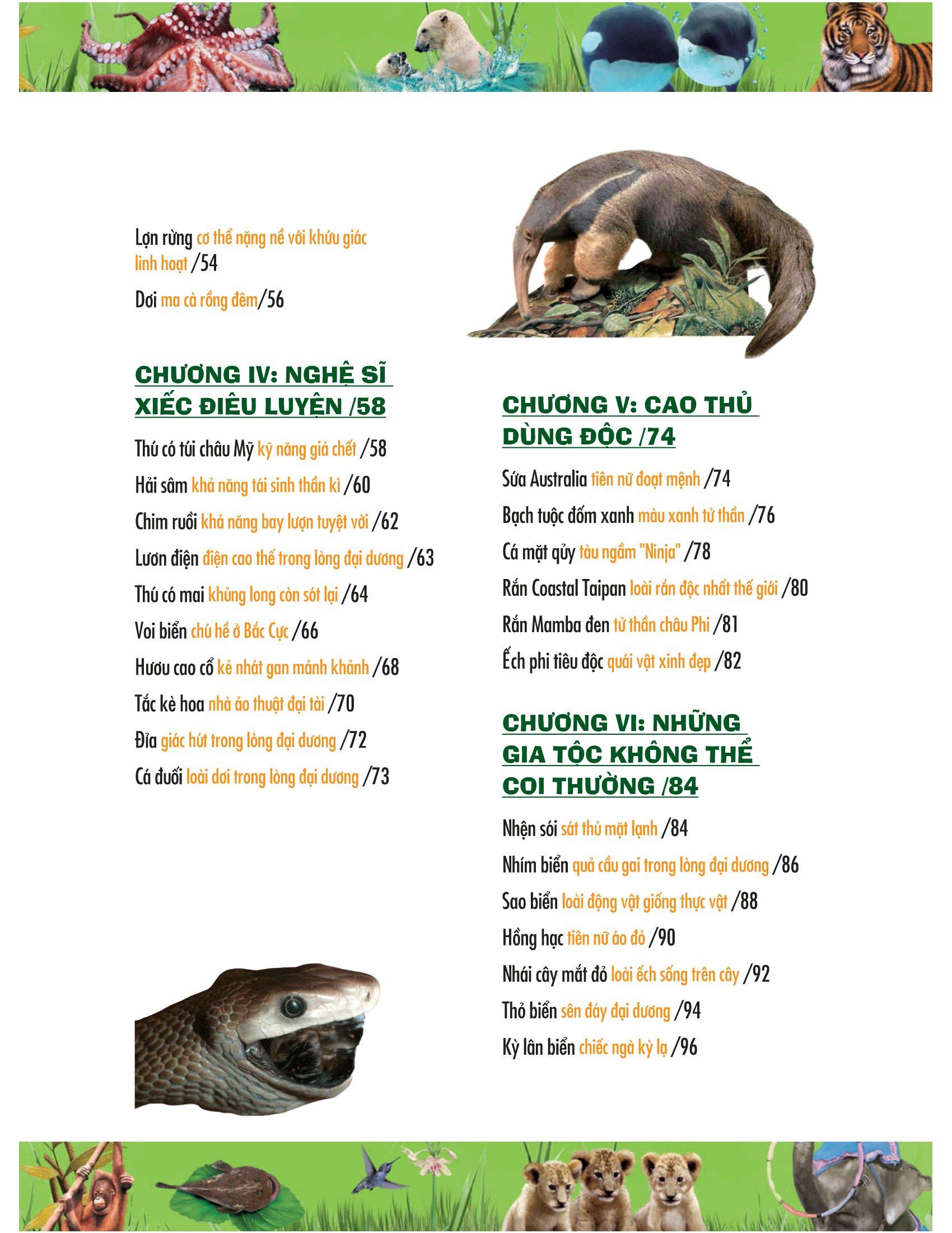 Cuốn sách này sử dụng những bức tranh sinh động và ngôn ngữ hài hước để giới thiệu với các bạn về đặc điểm inh hoạt, khả năng sinh tồn, những nét nổi bật của những loài động vật khỏe nhất, xấu xí nhất, tàn nhẫn nhất, nguy hiểm nhất, hung dữ nhất và kì diệu nhất… Cuốn sách sẽ cung cấp những kiến thức giúp chúng ta hiểu biết thêm về những loài động vậ