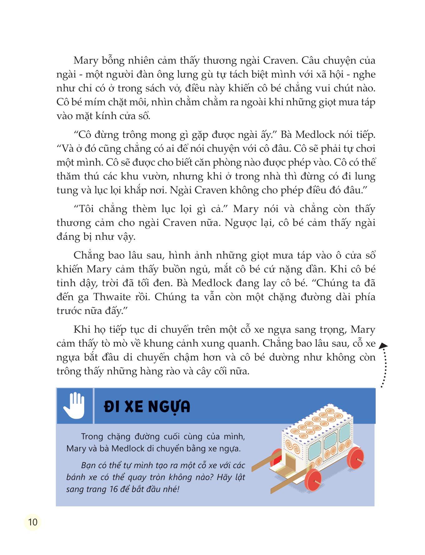 Mọi người đều nói Mary Lennox có vẻ ngoài chẳng ai ưa nổi, cái mặt gầy choắt còn biểu cảm thì cau có, khó gần. Mary sinh ra ở Ấn Độ. Cha của cô bé làm việc cho chính phủ Anh, còn mẹ cô bé là một phụ nữ vô cùng xinh đẹp, có điều dường như họ chẳng hề bận tâm đến việc nuôi dạy đứa con gái nhỏ của m.ình. Lúc nào Mary cũng ở cùng bảo mẫu và bị tách xa khỏi cha mẹ hết mức có thể. Mẹ của Mary không thích nghe thấy tiếng khóc của con gái m.ình, cho nên những người hầu trong nhà luôn cố gắng chiều theo mọi yêu cầu của cô bé. Bởi thế mà chẳng có gì đáng ngạc nhiên khi lớn lên, cô bé lại trở thành một đứa trẻ ích kỷ.