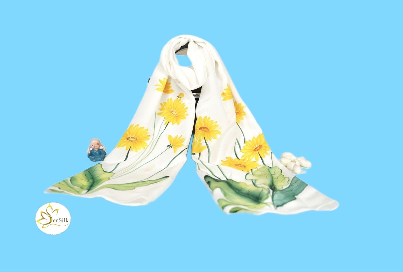 Khăn Lụa Tơ Tằm Vẽ Tay Hoa Đồng Tiền  Vàng – loài hoa tượng trưng cho hạnh phúc và tinh thần lạc quan. Thường được dùng như một món quà tặng để khích lệ và động viên tinh thần.   Khăn Lụa Vẽ Tay SenSilk làm một tác phẩm nghệ thuật có 1 không 2 được tạo nên từ đôi bàn tay tài hoa của người họa sỹ làng nghề truyền thống Việt Nam với Tơ Lụa Bảo Lộc cao cấp. Đặc biệt: Tác phẩm vẽ theo yêu cầu riêng. SenSilk trao tận tay Quý khách hàng trong vòng 3-5 ngày Khăn vẽ không phai màu, hướng dẫn sử dụng vui lòng xem chi tiết Đóng gói: bộ sản phẩm đầy đủ gồm khăn, hộp, thiệp và túi giấy Khăn và Tranh được vẽ bởi nghệ nhân làng nghề truyền thống Chất liệu: 100% Lụa Tơ Tằm Cao Cấp Bảo Lộc (Lâm Đồng) Màu nhuộm hoàn toàn tự nhiên, thân thiện môi trường Thương hiệu: SenSilk (đã đăng ký Sở hữu Trí tuệ) Màu vẽ cao cấp nhập khẩu Kích thước: 160x55cm Xuất xứ: Việt Nam   ĐẶC ĐIỂM NỔI BẬT CỦA KHĂN LỤA VẼ TAY SENSILK – SenSilk nhận vẽ theo yêu cầu riêng của bạn nha – Họa tiết vẽ tinh tế, màu vẽ cao cấp nhập khẩu không phai màu – Chất liệu 100% lụa tơ tằm tự nhiên, mềm mại, thấm hút mồ hôi tốt – Khăn được nhuộm màu bằng nguyên liệu nhập khẩu, an toàn cho da     HƯỚNG DẪN SỬ DỤNG LỤA TƠ TẰM