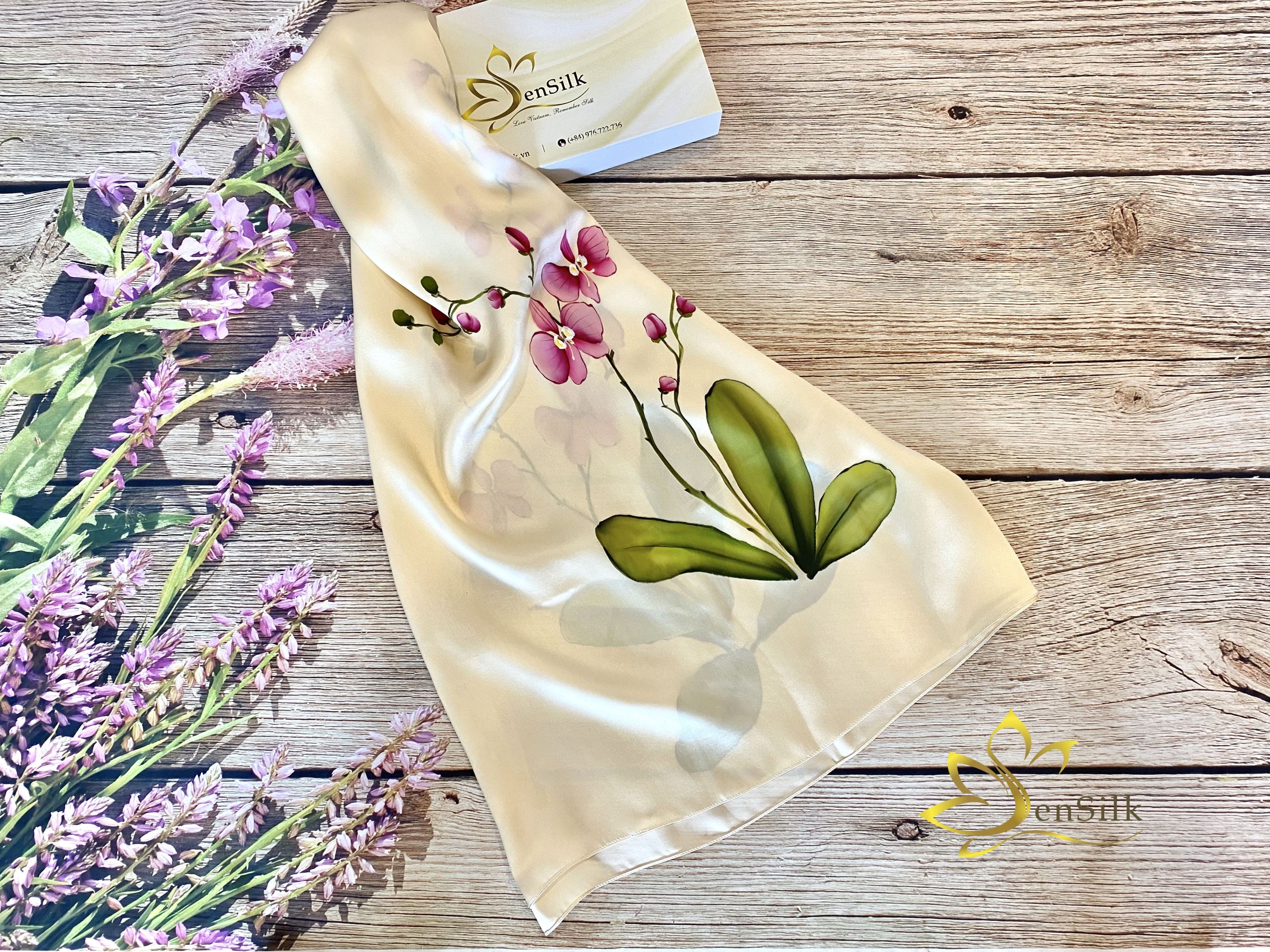 Khăn Lụa Tơ Tằm Vẽ Tay Hoa Lan SenSilk mang sắc đẹp và hương thơm của một loài hoa quý tộc, chúng có đầy đủ sự kiêu sa, đài cát và quý phái của một bậc vương giả! Hoa Lan cũng là món quà tết hết sức ý nghĩa cho các gia đình Việt.