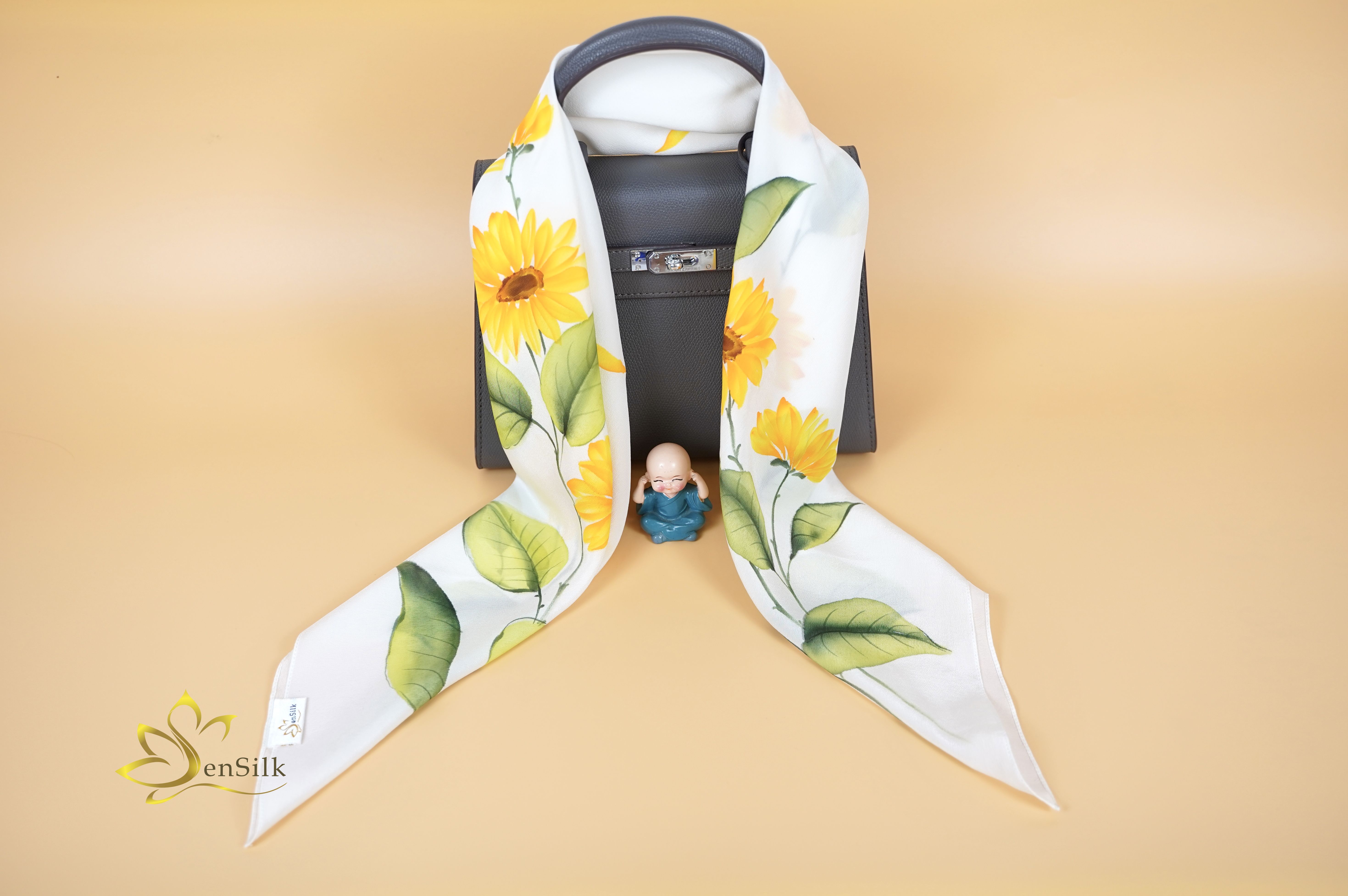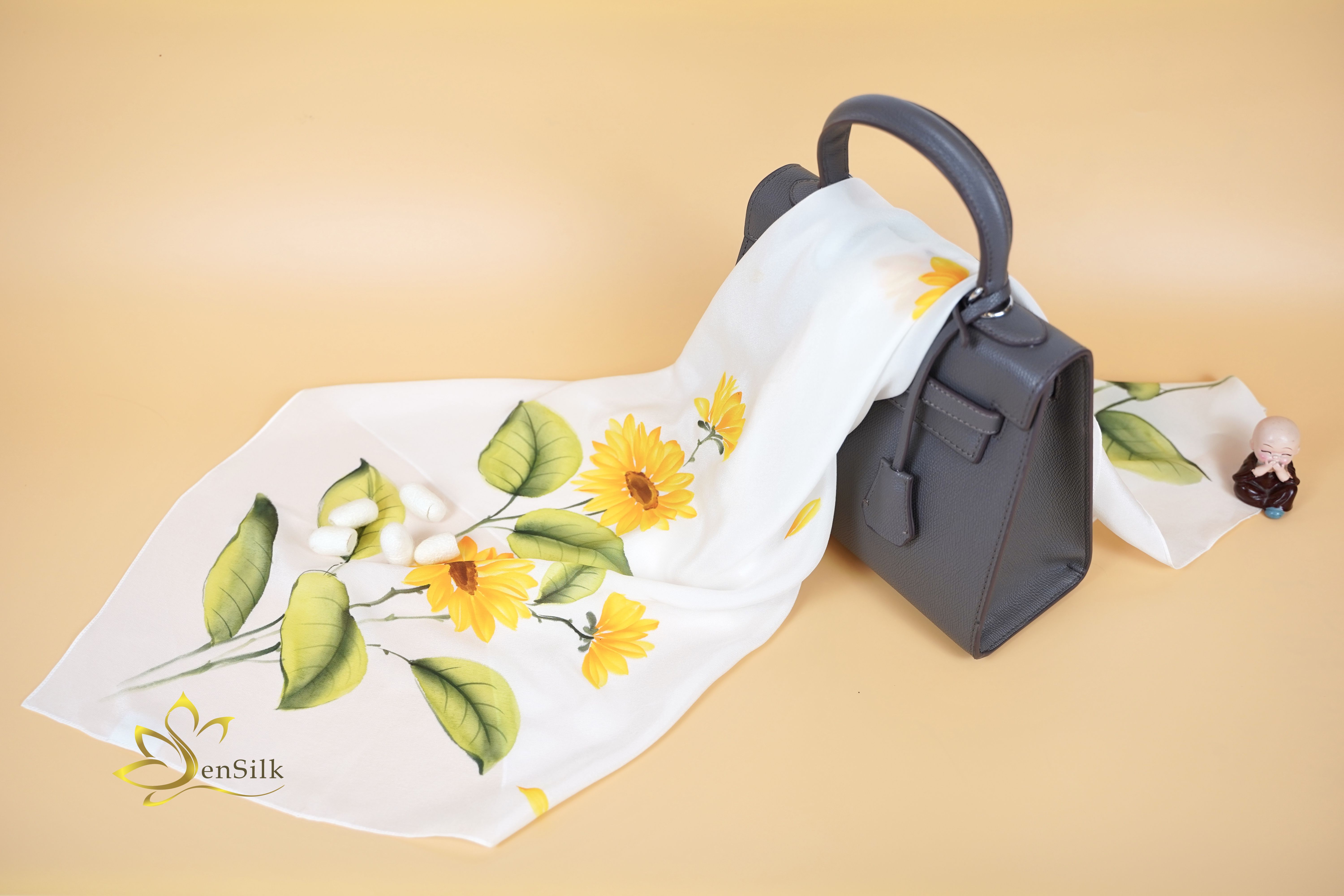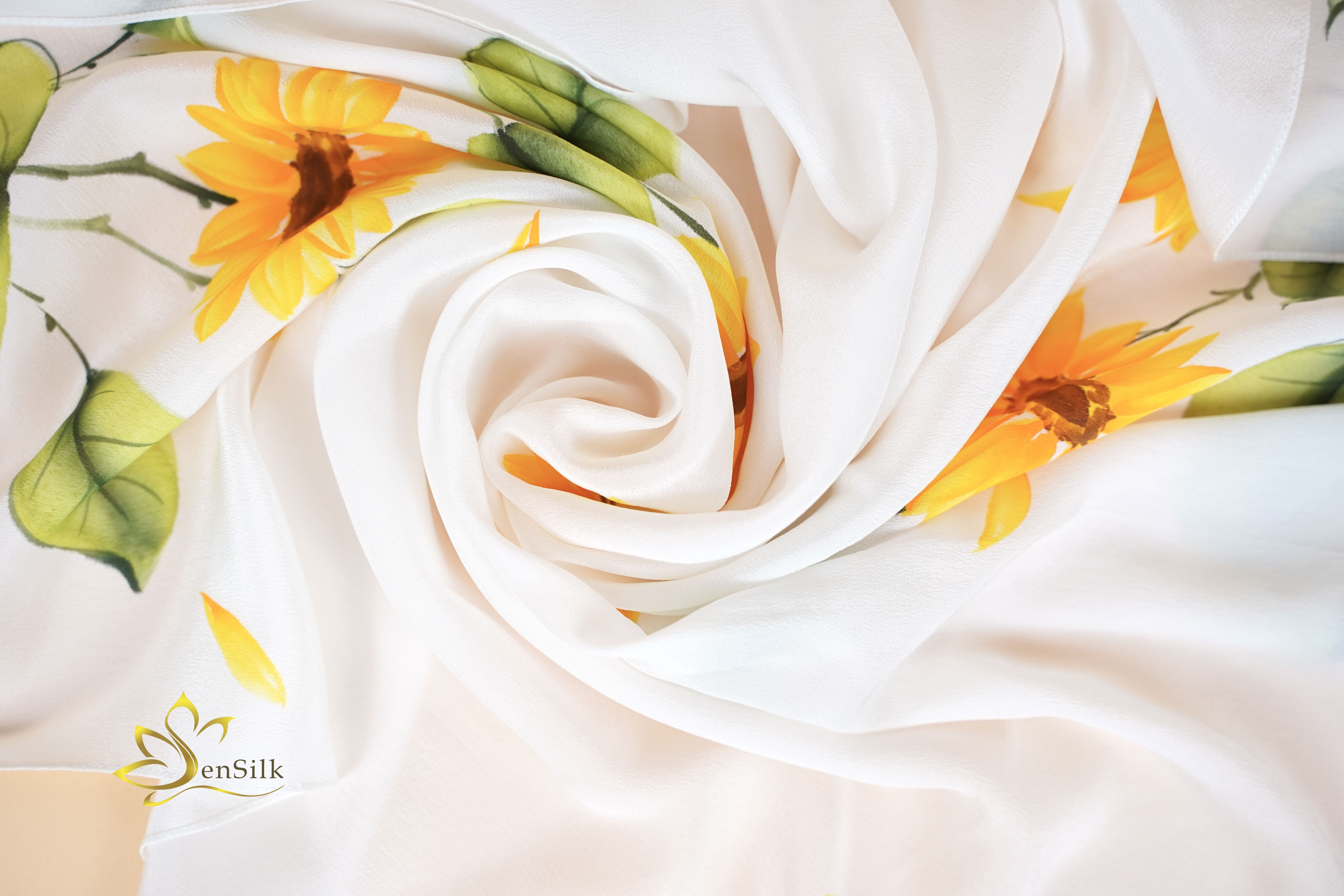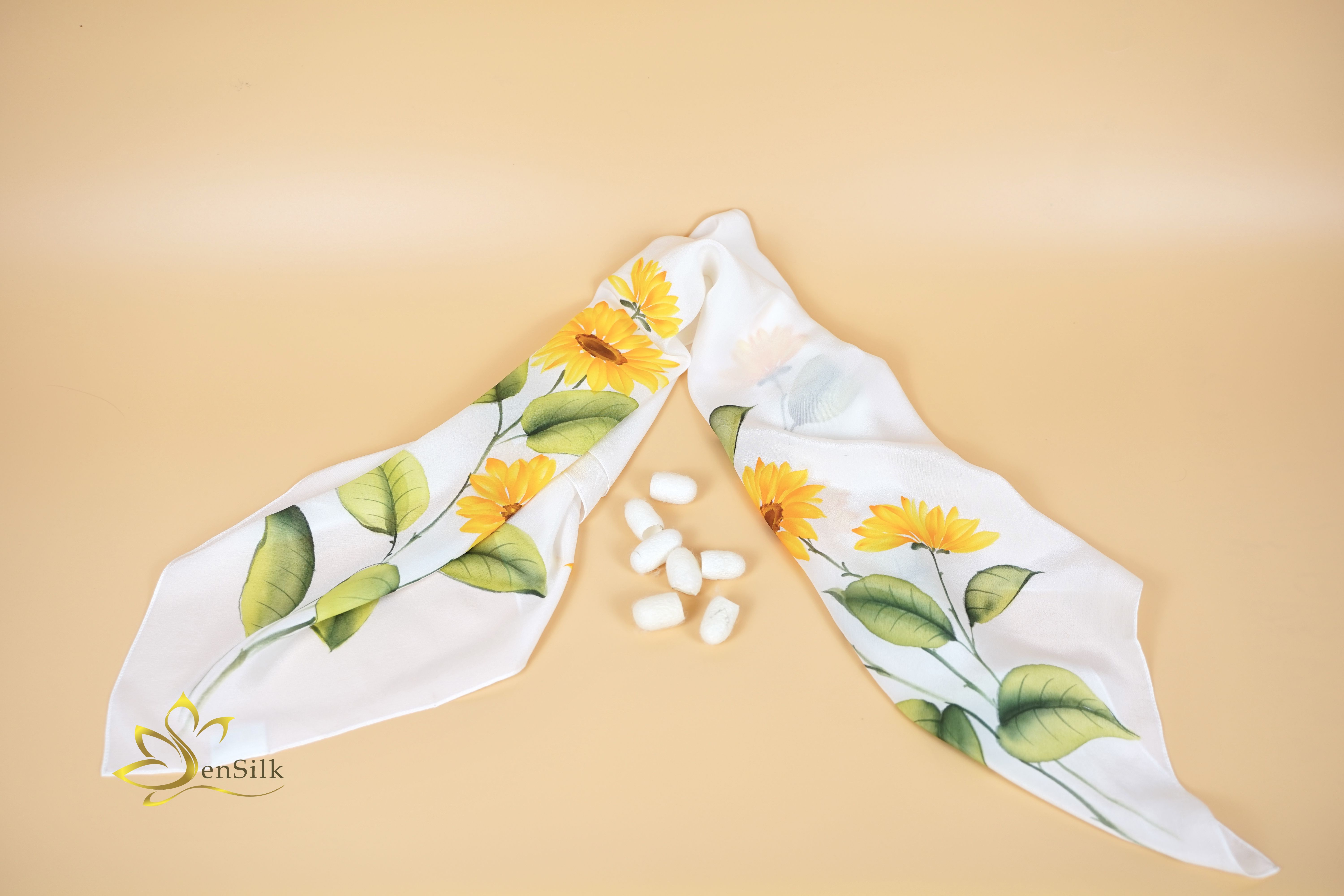 Khăn Lụa Vuông Vẽ Tay Hoa Hướng Dương SenSilk loài hoa tình yêu luôn hướng về phía mặt trời nên thường là biểu tượng của lòng trung thành, chung thủy sâu sắc, sự kiên định đó cũng biểu thị cho sức mạnh, uy quyền, sự ấm áp…