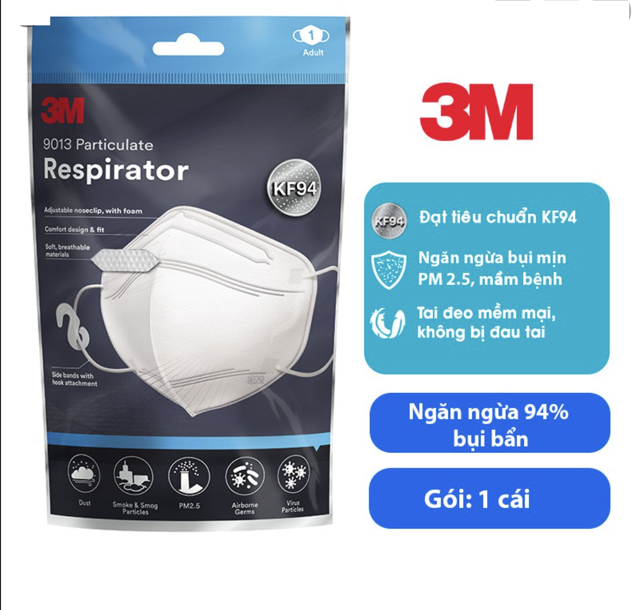 Mua tại Tiktok- Khẩu trang 3M 9013 đạt tiêu chuẩn KF94 và được FDA Hàn Quốc công nhận khẩu trang 3M 9013 lọc được tối thiểu 94% bụi mịn từ 0,1 – 0,5 micromet. Ngăn ngừa bụi mịn PM2.5, mầm bệnh trong không khí, khói bụi…Phù hợp dùng trong công việc mài, cắt, y tế, ngăn ngừa virút và các hạt tiểu phân gây hại khác trong không khí, và những công việc phát sinh bụi khá