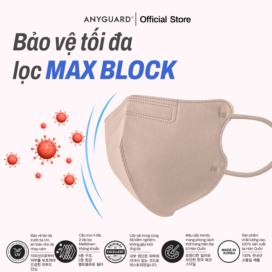 Khẩu Trang Nhập Khẩu Hàn Quốc ANYGUARD, Khẩu Trang  2D Solution 4 Lớp Ngăn Tia UV, An Toàn Cho Da Nhạy Cảm, Màu Creamy / Xám / Hồng (Túi 5 chiếc) được sản xuất 100% tại Hàn Quốc, cấu trúc 4 lớp, thiết kế 2D độc đáo siêu thoáng khí và dễ thở. Khẩu trang 2D Solution đạt chứng nhận “Dermatest Excellent” từ Viện nghiên cứu da đẳng cấp quốc tế tại Đức về chất liệu vải lớp trong cùng an toàn cho da; ngăn các tia cực tím có hại cho da như UVA, UVB. Tone màu sắc pastel được giới trẻ Hàn cực yêu thích, mang phong cách thời trang hiện tại từ  KPOP stars tại xứ sở kim chi. A. THÔNG TIN SẢN PHẨM: 1. Cấu trúc 4 lớp — 1 lớp vải không dệt SB , giúp ngăn giọt bắn, không thấm nước — 2 lớp màng vi lọc Melt Blown giúp ngăn 99% vi khuẩn, bụi bẩn — 1 lớp vải không dệt MF - An Toàn Cho Da, không gân xơ, không bông xù sợi vải và hạt nhựa, an toàn cho da nhạy cảm 2. Thiết kế:  — Thiết kế form 2D (2 nếp gấp) tạo không gian tối đa, thoáng khí và siêu dễ thở — Nẹp mũi dễ dàng điều chỉnh vừa vặn với từng khuôn mặt — Quai đeo mềm mại, thoải mái cho người sử dụng trong thời gian dài — Màu sắc đa dạng, trendy phù hợp với mọi lứa tuổi 3. Công nghệ sản xuất: — Sản phẩm sản xuất tại Hàn Quốc; nhập khẩu và đóng gói tại Việt Nam. — Sản xuất theo tiêu chuẩn công nghệ Hàn Quốc ISO 2015:9001, CE — Xuất khẩu sang nhiều thị trường quốc tế như Châu Âu, Mỹ, Nhật, Hàn Quốc… 4. Công dụng sản phẩm: Bảo vệ người sử dụng tránh bị lây nhiễm bởi các loại vi khuẩn, virus, dịch bệnh và các tác nhân gây hại qua đường hô hấp (khói xe, bụi, bụi mịn…) B. CHỨNG NHẬN/ CHỨNG CHỈ SẢN PHẨM: 1. Chứng Nhận Sản Phẩm — Vải lọc đạt chuẩn kháng 99% vi khuẩn — SKIN SAFETY: Đạt chứng nhận “Dermatest Excellent” từ Viện nghiên cứu da đẳng cấp quốc tế tại Đức về chất liệu vải lớp trong cùng an toàn cho da — UV PROTECTION: Chứng nhận chất liệu vải an toàn giúp hạn chế tối đa các tác nhân gây hại về da, ngăn các tia cực tím có hại cho da như UVA, UVB 2. Chứng Nhận Nhà Máy — Sản phẩm được sản xuất theo tiêu chuẩn công nghệ Hàn Quốc: ISO 2015:9001: Đạt tiêu chuẩn về Hệ Thống Quản Lý Chất Lượng C. KÍCH THƯỚC & QUI CÁCH ĐÓNG GÓI: - Kích thước sản phẩm : 150x120cm - Kích thước bao bì : 260x170cm - Màu sắc: Be / Xám / Hồng - Trọng lượng: 150g/ 1 túi - Quy cách đóng gói: Túi 5 cái D. HƯỚNG DẪN SỬ DỤNG & BẢO QUẢN: 1. Hướng dẫn sử dụng: - Mở rộng 2 mảnh của khẩu trang, đưa ngang sống mũi sao cho ôm khít phần mũi và cằm  - Đeo dây vào hai bên tai  - Ấn và vuốt thanh nẹp mũi ôm khít vào hai sống mũi  - Kiểm tra và điều chỉnh lại lần nữa sao cho khẩu trang ôm khít khuôn mặt 2. Bảo quản: Bảo quản nơi khô ráo, thoáng mát, tránh ánh nắng trực tiếp. ANYGUARD - THƯƠNG HIỆU KHẨU TRANG SỐ #1 HÀN QUỐC Được sáng tạo bởi tập đoàn E&W (1992) – Tập đoàn dẫn đầu về sản xuất với lịch sử lâu đời tại xứ sở kim chi. Khẩu trang ANYGUARD được sản xuất trong hệ thống phòng sạch theo công nghệ tiên tiến Hàn Quốc, đã được kiểm nghiệm và chứng nhận: ISO 13485 : 2016, chứng nhận FDA – Hoa Kỳ và cấp dấu CE lưu hành tại Châu Âu. Tại Hàn Quốc, ANYGUARD là thương hiệu được tin dùng và đã có mặt trên khắp hệ thống các siêu thị lớn, cửa hàng phân phối bán lẻ như: NoBrand, Emart24, CU, GS25, Coupang.  Hòa nhập vào thị trường Việt Nam - ANYGUARD cam kết mang đến sản phẩm chất lượng đỉnh cao cùng trải nghiệm thoải mái cho người tiêu dùng Việt.