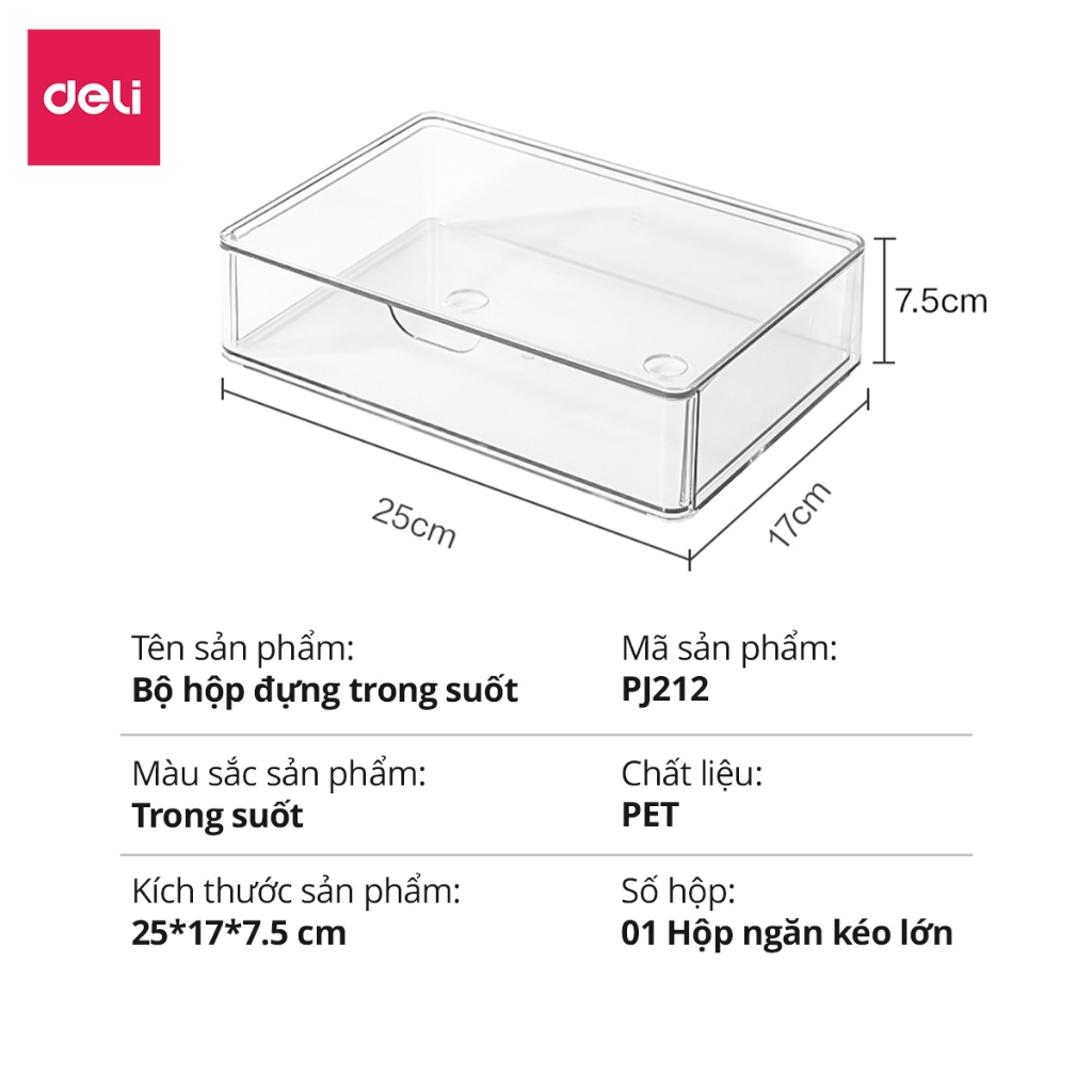 THÔNG TIN SẢN PHẨM: Tên sản phẩm: Hộp đựng đồ đa năng Deli Mã sản phẩm: PJ210/ PJ211/ PJ212 Chất liệu: Nhựa PET trong suốt Xuất xứ: Trung Quốc