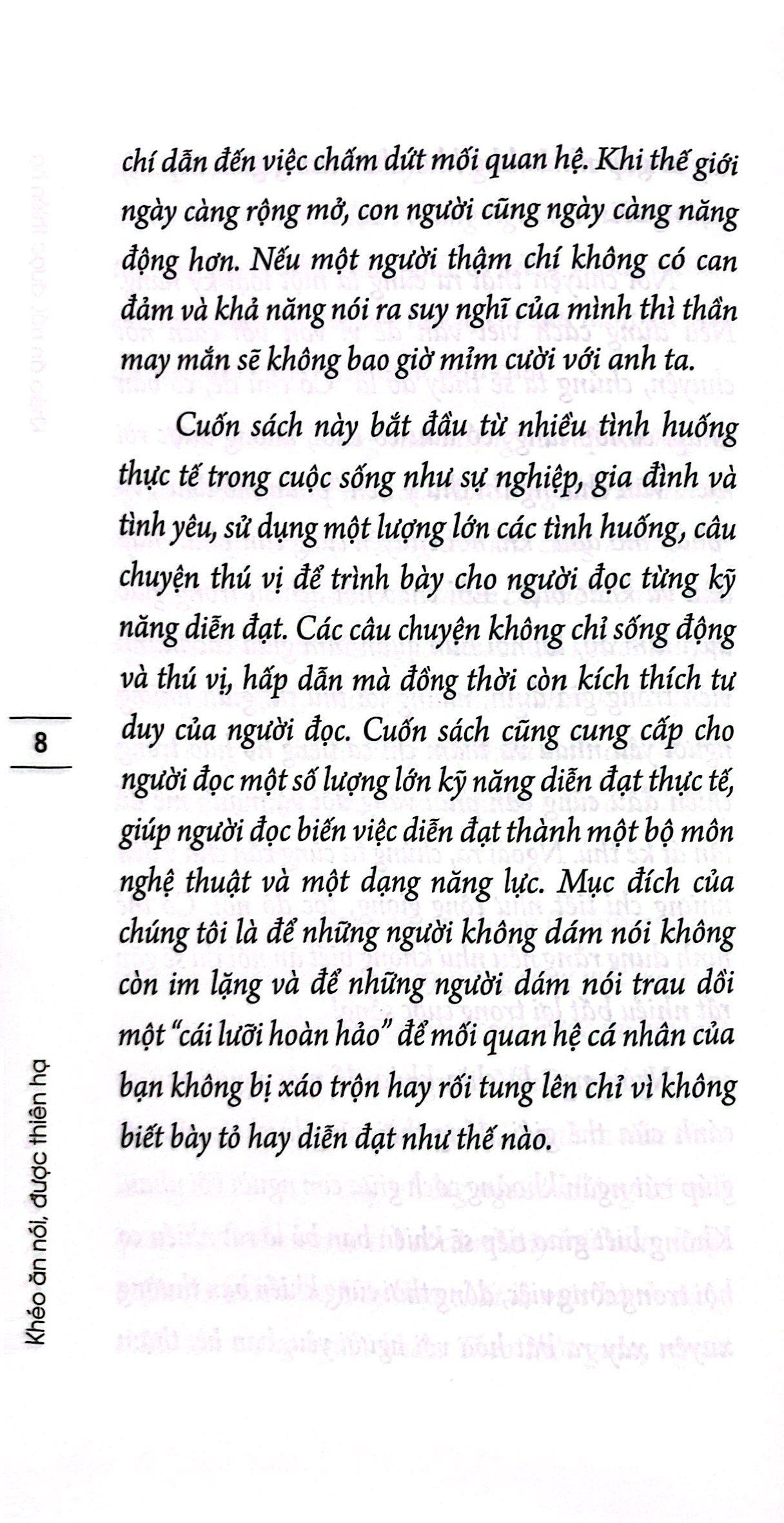 Cuốn sách KHÉO ĂN NÓI, ĐƯỢC THIÊN HẠ gồm nhiều tình huống thực tế trong cuộc sống như sự nghiệp, gia đình và tình yêu, sử dụng một lượng lớn các tình huống, câu chuyện thú vị để trình bày cho người đọc từng kỹ năng diễn đạt. Các câu chuyện không chỉ sống động và thú vị, hấp dẫn mà đồng thời còn kích thích tư duy của người đọc. Cuốn sách cũng cung cấp cho người đọc một số lượng lớn kỹ năng diễn đạt thực tế, giúp người đọc biến việc diễn đạt thành một bộ môn nghệ thuật và một dạng năng lực. Mục đích của chúng tôi là để những người không dám nói không còn im lặng và để những người dám nói trau dồi một “cái lưỡi hoàn hảo” để mối quan hệ cá nhân của bạn không bị xáo trộn hay rối tung lên chỉ vì không biết bày tỏ hay diễn đạt như thế nào.