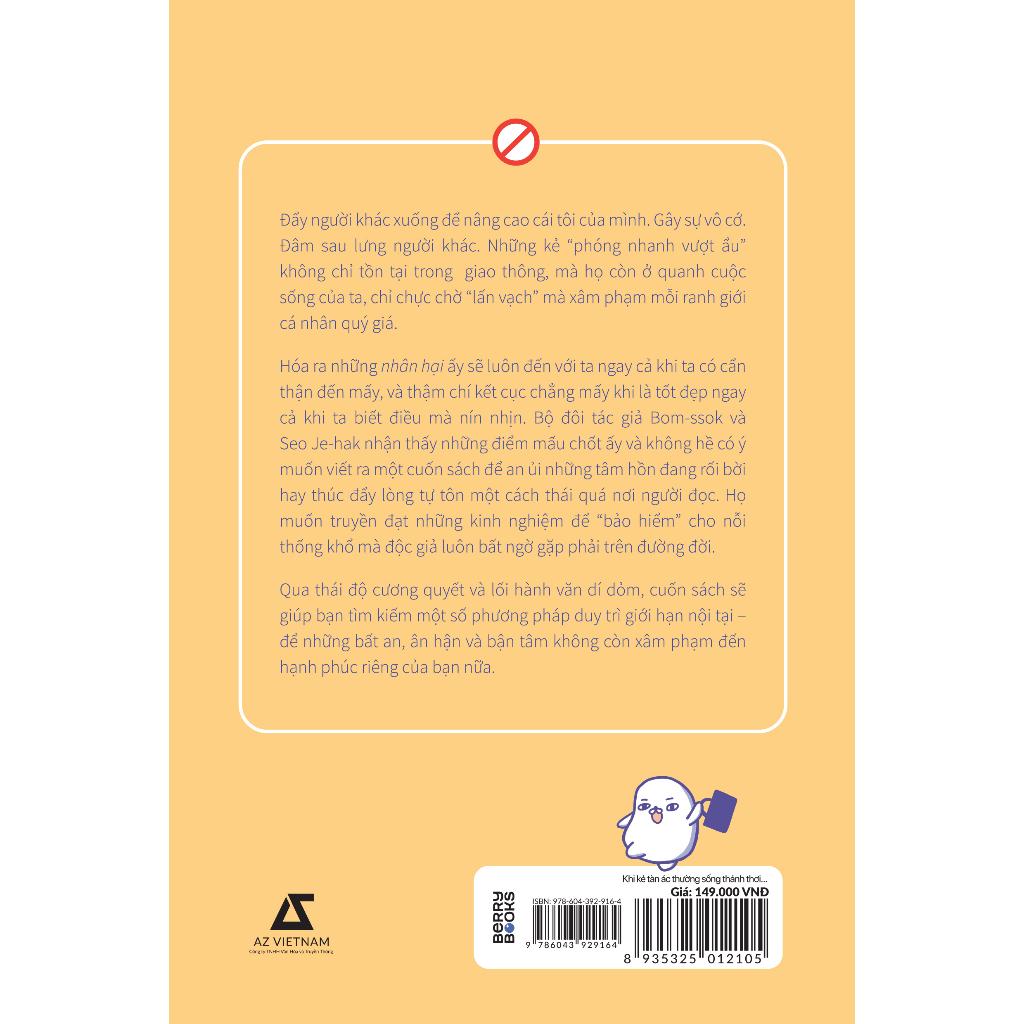 Hóa ra những nhân hại ấy sẽ luôn đến với ta ngay cả khi ta có cẩn thận đến mấy, và thậm chí kết cục chẳng mấy khi là tốt đẹp ngay cả khi ta biết điều mà nín nhịn. Bộ đôi tác giả Bom-ssok và Seo Je-hak nhận thấy những điểm mấu chốt ấy và không hề có ý muốn viết ra một cuốn sách để an ủi những tâm hồn đang rối bời hay thúc đẩy lòng tự tôn một cách thái quá nơi người đọc. Họ muốn truyền đạt những kinh nghiệm để “bảo hiểm” cho nỗi thống khổ mà độc giả luôn bất ngờ gặp phải trên đường đời.