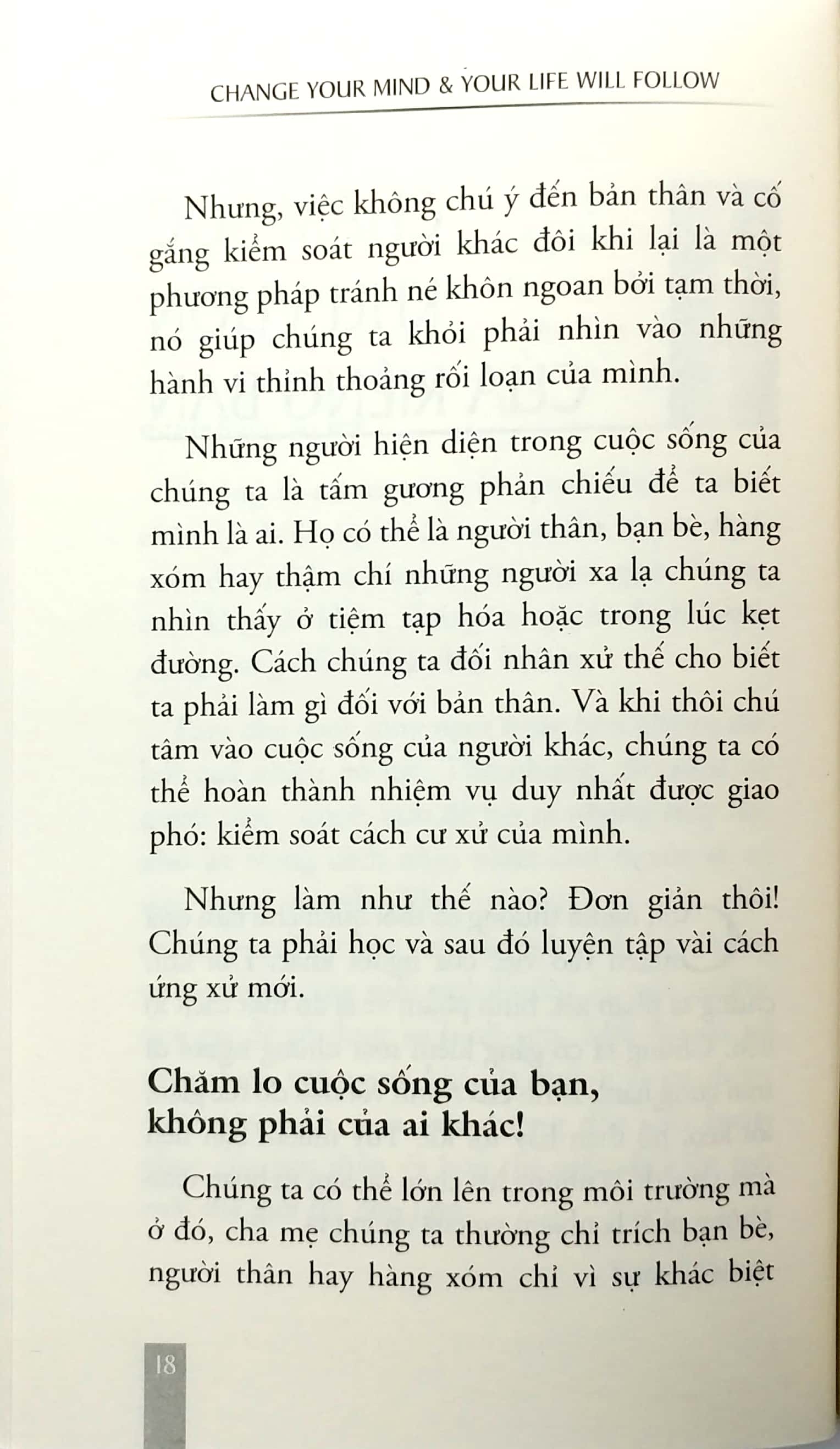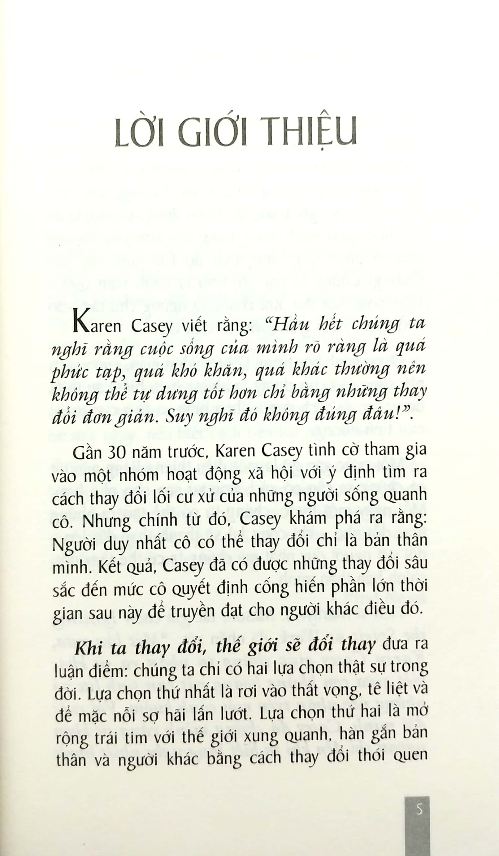 Khi ta thay đổi, thế giới sẽ đổi thay đưa ra luận điểm: Chúng ta chỉ có hai lựa chọn thật sự trong đời. Lựa chọn thứ nhất là rơi vào thất vọng, tê liệt và để mặc nỗi sợ hãi lấn lướt. Lựa chọn thứ hai là mở rộng trái tim với thế giới xung quanh, hàn gắn bản thân và người khác bằng cách thay đổi thói quen hành động trong các mối quan hệ. Chúng ta không thể thay đổi một ai đó. Chúng ta thường cũng không thể thay đổi hoàn cảnh. Nhưng chúng ta có thể thay đổi chính cách ứng xử của mình. Chúng ta có thể học cách suy nghĩ trước khi hành động. Chúng ta có thể học cách hành động bằng trái tim yêu thương thay vì phản ứng bằng thái độ tức giận hay tổn thương. Chúng ta hãy ghi nhớ là mình nắm quyền kiểm soát mọi thứ. Khi chúng ta ngừng chú tâm vào khó khăn, cách giải quyết sẽ xuất hiện.