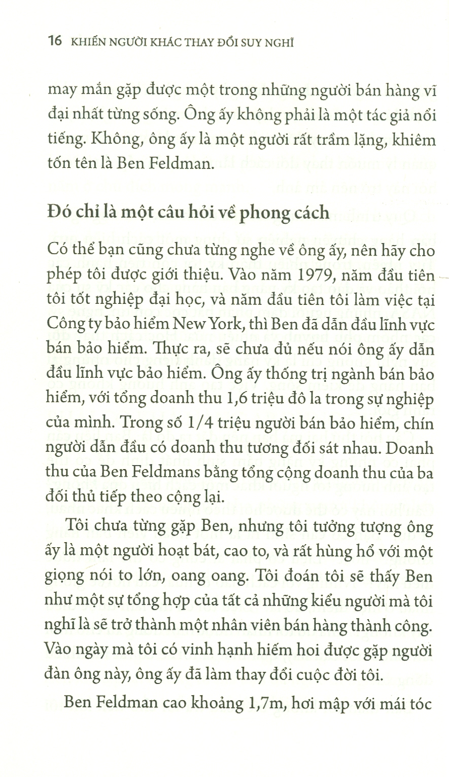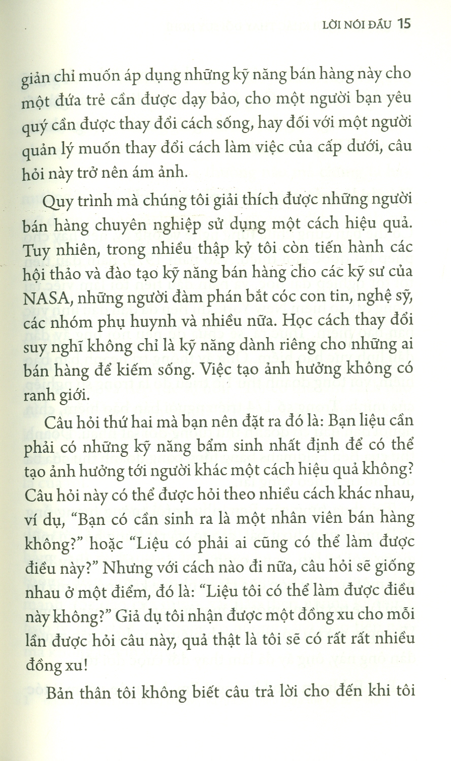 Chắc hẳn bạn biết rất nhiều người cần thay đổi điều gì đó trong cuộc sống của họ, nhưng dù bạn có cố gắng đến mấy, có ý tốt đến mấy, họ vẫn không chịu thay đổi. Bởi lẽ con người về cơ bản đều sợ thay đổi. Là một người kinh doanh, một người cha, một người bạn và cũng là một chuyên gia tư vấn, Rob Jolles hiểu rất rõ viễn cảnh ấy. Từ kinh nghiệm kinh doanh thành công và nhiều năm nghiên cứu, Rob Jolles đã đúc kết lại một công thức đơn giản giúp bạn dẫn dắt những người khác tự khám phá ra họ cần thay đổi những gì và vì sao. Có thể bạn muốn bán được hàng, cũng có thể bạn đang muốn cải thiện một mối quan hệ, dù có là gì thì những lời khuyên hữu ích của Jolles.