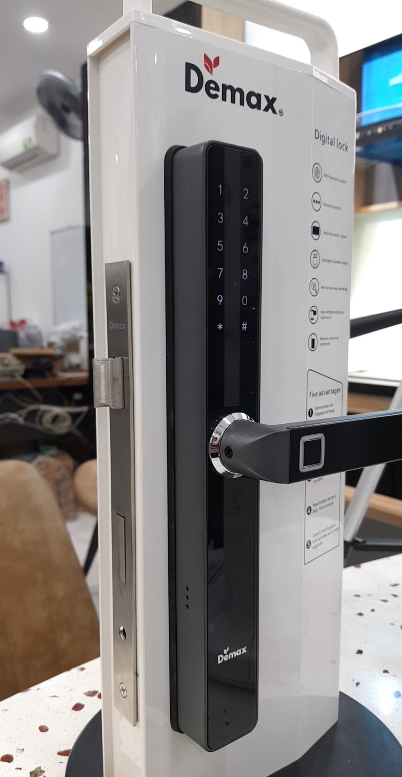 Khóa vân tay cửa nhôm xingfa, cửa sắt DEMAX SL103 được sản xuất tại Malaysia theo dây chuyền công nghệ hiện đại của Đức (Germany Quality). Khóa vân tay Demax với nhiều ưu điểm vượt trội về chất lượng cũng như thiết kế, thời gian bảo hành đến 3 năm đã trở thành 1 trong những dòng khóa được yêu thích nhất hiện nay.