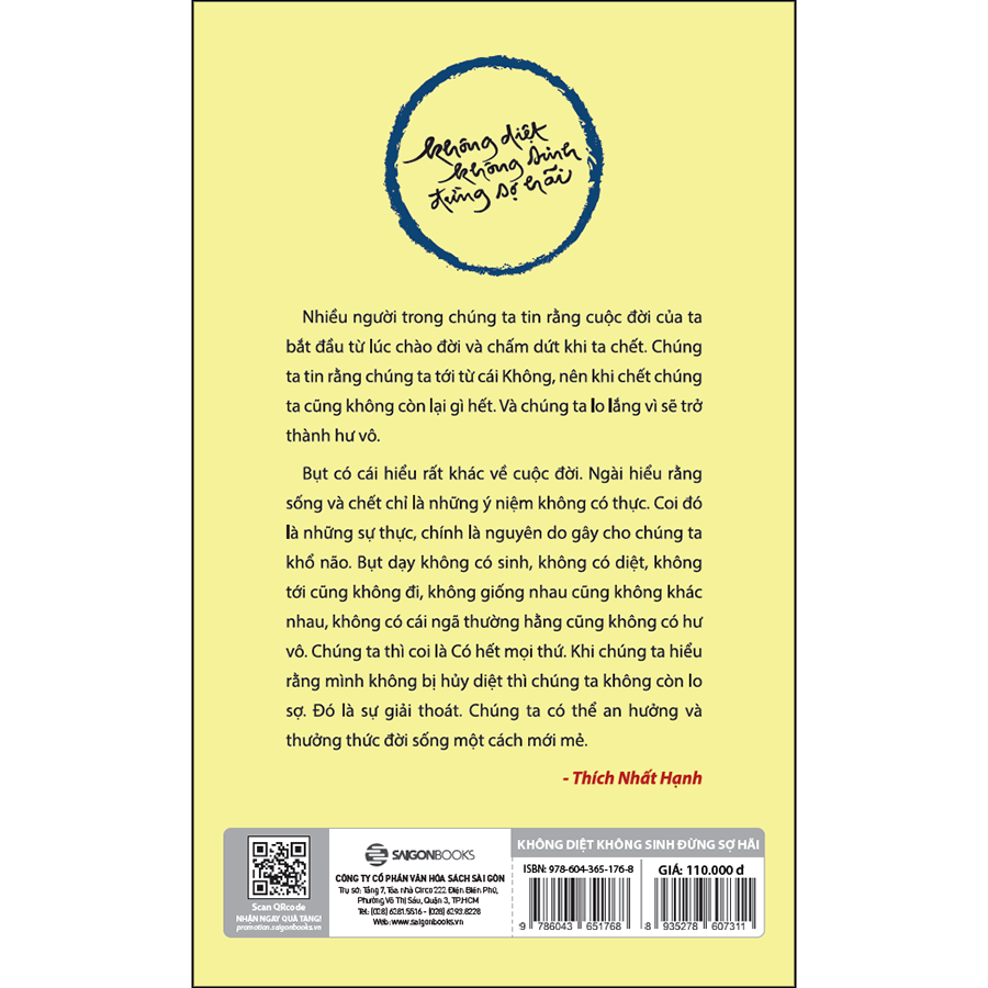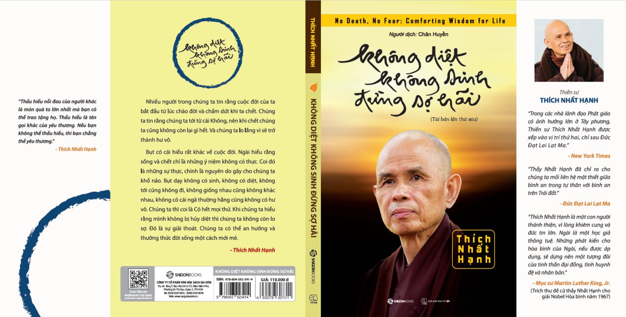 Nhiều người trong chúng ta tin rằng cuộc đời của ta bắt đầu từ lúc chào đời và kết thúc khi ta chết. Chúng ta tin rằng chúng ta tới từ cái Không, nên khi chết chúng ta cũng không còn lại gì hết. Và chúng ta lo lắng vì sẽ trở thành hư vô.  Bụt có cái hiểu rất khác về cuộc đời. Ngài hiểu rằng sống và chết chỉ là những ý niệm không có thực. Coi đó là sự thực, chính là nguyên do gây cho chúng ta khổ não. Bụt dạy không có sinh, không có diệt, không tới cũng không đi, không giống nhau cũng không khác nhau, không có cái ngã thường hằng cũng không có hư vô. Chúng ta thì coi là Có hết mọi thứ. Khi chúng ta hiểu rằng mình không bị hủy diệt thì chúng ta không còn lo sợ. Đó là sự giải thoát. Chúng ta có thể an hưởng và thưởng thức đời sống một cách mới mẻ.  Không diệt Không sinh Đừng sợ hãi là tựa sách được Thiền sư Thích Nhất Hạnh viết nên dựa trên kinh nghiệm của chính mình. Ở đó, Thầy Nhất Hạnh đã đưa ra một thay thế đáng ngạc nhiên cho hai triết lý trái ngược nhau về vĩnh cửu và hư không: “Tự muôn đời tôi vẫn tự do. Tử sinh chỉ là cửa ngõ ra vào, tử sinh là trò chơi cút bắt. Tôi chưa bao giờ từng sinh cũng chưa bao giờ từng diệt” và “Nỗi khổ lớn nhất của chúng ta là ý niệm về đến-đi, lui-tới.”  Được lặp đi lặp lại nhiều lần, Thầy khuyên chúng ta thực tập nhìn sâu để chúng ta hiểu được và tự mình nếm được sự tự do của con đường chính giữa, không bị kẹt vào cả hai ý niệm của vĩnh cửu và hư không. Là một thi sĩ nên khi giải thích về các sự trái ngược trong đời sống, Thầy đã nhẹ nhàng vén bức màn vô minh ảo tưởng dùm chúng ta, cho phép chúng ta (có lẽ lần đầu tiên trong đời) được biết rằng sự kinh hoàng về cái chết chỉ có nguyên nhân là các ý niệm và hiểu biết sai lầm của chính mình mà thôi.  Tri kiến về sống, chết của Thầy vô cùng vi tế và đẹp đẽ. Cũng như những điều vi tế, đẹp đẽ khác, cách thưởng thức hay nhất là thiền quán trong thinh lặng. Lòng nhân hậu và từ bi phát xuất từ suối nguồn thâm tuệ của Thiền sư Thích Nhất Hạnh là một loại thuốc chữa lành những vết thương trong trái tim chúng ta.