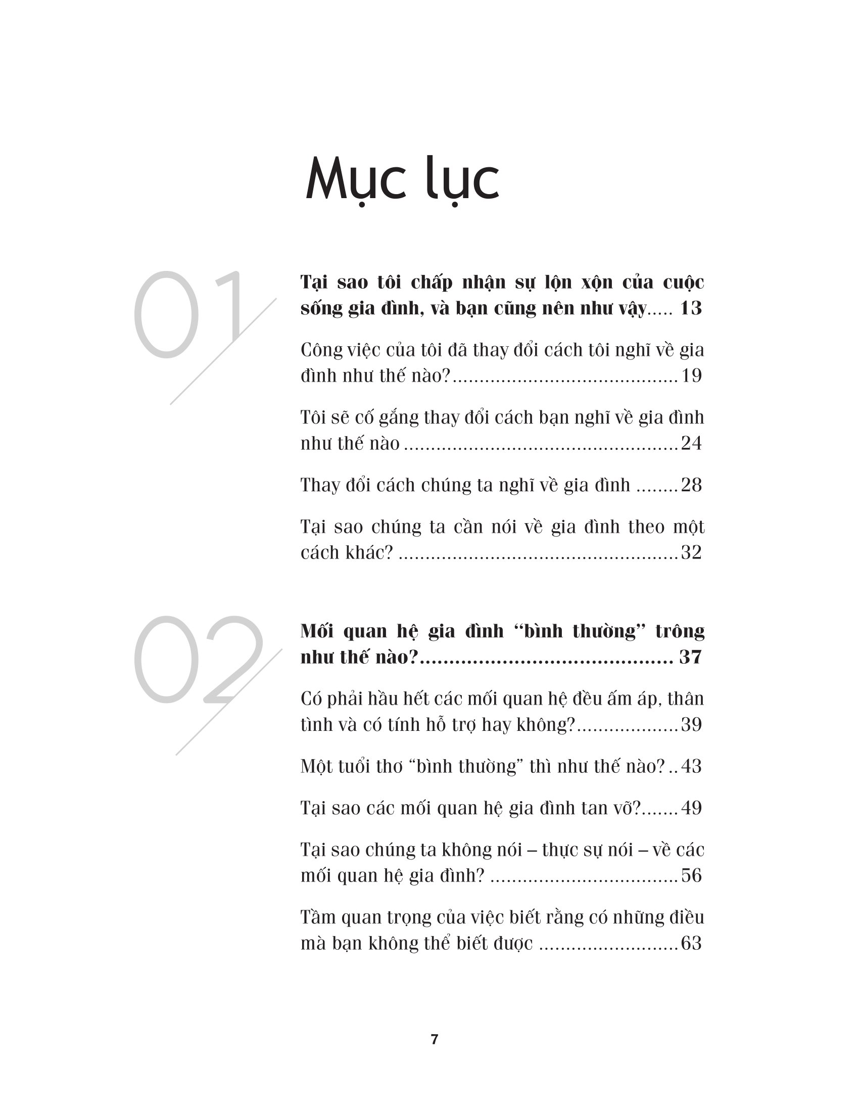 Không Gia Đình Nào Hoàn Hảo Bạn định nghĩa gia đình là gì? Gia đình là nơi ẩn náu khỏi những thăng trầm của cuộc sống hằng ngày. Gia đình giống như một tấm lưới an toàn, chở che và bảo vệ. Gia đình là yêu thương. Và không giống như bất kì tình yêu thương nào khác, đó là tình yêu thương vô điều kiện. Cho dù có làm gì hay nói gì, bạn cũng không thể tìm được lời giải thích xác đáng cho tình yêu thương giữa các thành viên trong gia đình. Nhưng thực tế là Không Gia Đình Nào Hoàn Hảo vì gia đình nào cũng có những mâu thuẫn, xung đột và bất đồng. Bạn sẽ rất ngạc nhiên rằng có rất nhiều người như bạn. Không Gia Đình Nào Hoàn Hảo. Chỉ khi CHẤP NHẬN sự thật đó, dám nói ra và đối mặt với nó thì chúng ta mới được giải phóng khỏi nỗi đau khổ âm thầm của mình, tích cực tìm kiếm các giải pháp và sự giúp đỡ để cải thiện hoàn cảnh. Như vậy chúng ta mới có thể sống và phát triển trong một môi trường gia đình hạnh phúc thực sự. Bạn học được gì từ cuốn sách Không Gia Đình Nào Hoàn Hảo? Cuốn sách Không Gia Đình Nào Hoàn Hảo sẽ giúp bạn loại bỏ cảm giác lo âu, sự hoài nghi. Khắc phục cả việc lí tưởng hóa lẫn tiêu cực hóa, cuốn sách sẽ thay đổi cách chúng ta nghĩ và viết về gia đình. Đây là cuốn sách hữu ích cho bất kì ai quan tâm đến việc tìm hiểu thêm về gia đình của chính họ.