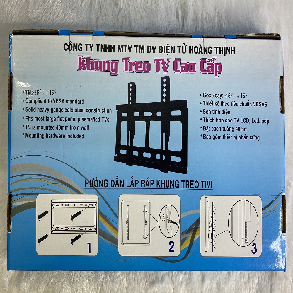 KHUNG TREO TIVI CỐ ĐỊNH 37-42INCH HOÀNG THỊNH Khung treo Tivi cố định 37 - 42 inch Ngang 340mm Cao 300mm Rộng 170mm Khả năng chịu tải: tối đa 50kg Mang lại sự thẩm mỹ Lắp đặt dễ dàng HƯỚNG DẪN LẮP RÁP TRÊN VỎ HỘP Thiết kế cố định, tiết kiệm diện tích Khung Treo Tivi Áp Tường 37 Inch - 42 Inch được làm từ thép sơn tĩnh điện, thiết kế chắc chắn, bền bỉ, áp sát tường nên không chiếm nhiều không gian, có thể lắp đặt ở phòng khách, phòng ngủ, văn phòng công ty, cửa hàng, Với khung treo cố định, tivi được áp sát tường, hở cách tường khoảng 5-8 cm tùy từng tivi, mang lại tính thẩm mỹ cao, góp phần làm gọn gàng không gian sử dụng. Khả năng chịu tải lên đến 50 kg Khung treo giúp cố định tivi Led, LCD, Plasma từ 37 - 42 inch và có khả năng chịu tải tối đa 50 kg, đảm bảo an toàn cho bạn trong quá trình sử dụng mà không còn lo các sự cố khiến tivi và nhà cửa hư hỏng. Lưu ý: Mảng tường để lắp tivi phải bằng phẳng, khô ráo, khả năng chịu lực tốt (đảm bảo chịu được trọng lượng của khung treo và tivi). Tắc kê, ốc vít kèm theo Bộ sản phẩm có kèm theo tắc kê, ốc, vít,… để bạn dễ dàng bắt khung vào tường và bắt tivi vào khung mà không phải tốn thêm bất kỳ khoản chi phí nào. Tuy nhiên ốc gắn vào lưng TV có tiêu chuẩn 6mm, một số loại tivi ngoại lệ có thể sử dụng ốc khác quy cách, quý khách vui lòng tự trang bị. MỘT SỐ HÌNH ẢNH THỰC TẾ SẢN PHẨM