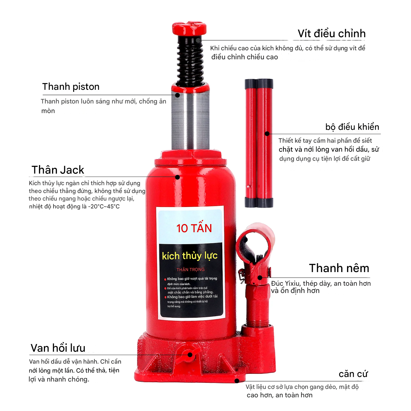 - Cấu tạo thủy lực 1 chiều, nâng bằng áp suất dầu, hồi về bằng lực nén lò xo