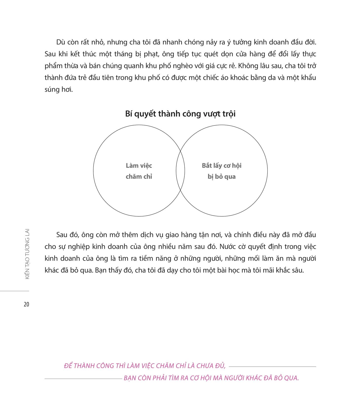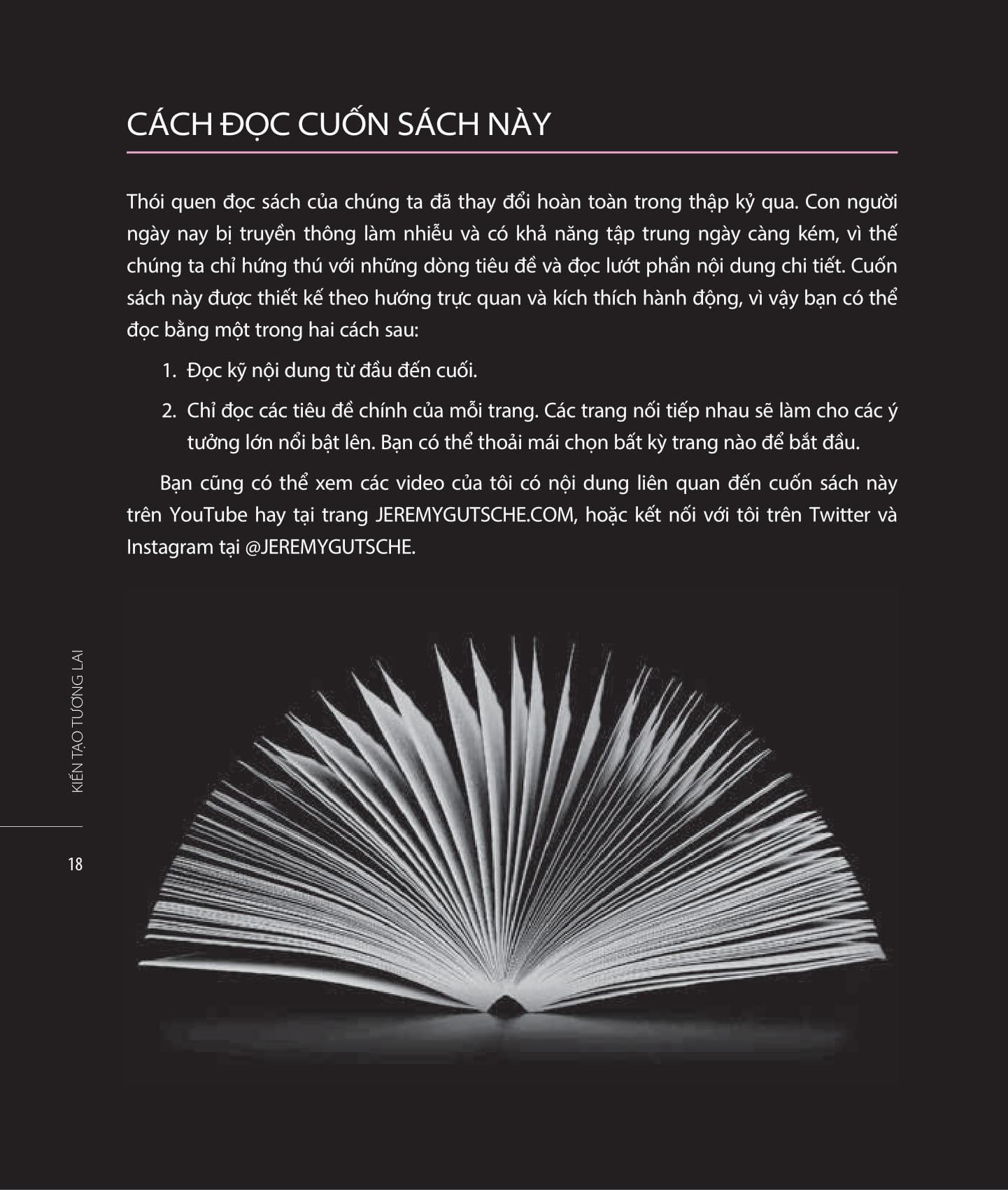 KIẾN TẠO TƯƠNG LAI – Chiến thuật tư duy đột phá SỔ TAY ĐỔI MỚI SÁNG TẠO – Từ ý tưởng đến thực tế Tương lai mà chúng ta sắp chứng kiến sẽ thế nào? Hiện nay, chúng ta đã có công nghệ đọc được suy nghĩ, vì thế hãy thử tưởng tượng đến lúc ta điều khiển điện thoại chỉ bằng ý nghĩ trong đầu, viết báo cáo mà không cần đến bàn phím, chơi trò chơi điện tử mà không cần dùng điều khiển, hay đi vào cửa hàng mà người bán đã biết trước bạn muốn mua gì. Rồi sẽ đến lúc ta có thể nhìn thế giới này bằng công nghệ thực tế ảo tăng cường, có thể đi lại an toàn hơn, có thể làm việc nhanh hơn, hay tập thể dục bằng một phương thức mới thú vị hơn. Điều gì sẽ xảy ra nếu ta có thể phục hồi được khả năng đi lại cho người bị khuyết tật, tăng cường thị lực, đẩy lùi bệnh tật, hay thậm chí có thể chỉnh sửa DNA? Cuộc sống này sẽ như thế nào nếu robot có thể giúp xây nhà, giao báo và lái xe đưa ta đi đến nơi về đến chốn? Đây không còn là chuyện tương lai xa vời, mà là những việc có thể xảy ra ở ngay thời điểm hiện tại. Nhờ công nghệ lai tạo, tinh thần khởi nghiệp xông xáo và trí tuệ nhân tạo, tốc độ phát triển của nhân loại ngày nay đã nhanh một cách thần tốc. Cuộc sống quen thuộc sắp thay đổi một cách ngoạn mục, và chính điều này sẽ mở ra vô vàn cơ hội ngay trước mắt ta. Bạn có sẵn sàng thay đổi để tạo nên một tương lai tốt đẹp hơn cho mình không? Các bước đột phá trong tương lai sắp tới của chúng ta có thể là một sản phẩm, dịch vụ, vai trò, ý tưởng hoàn toàn mới mẻ, hay đơn giản là chúng ta làm việc gì đó theo một cách hoàn toàn khác biệt. Điều này buộc ta phải thay đổi tư duy để thích nghi với những điều mới mẻ trong tương lai. Tuy nhiên, vấn đề là khả năng thay đổi của bạn sẽ bị hạn chế bởi 7 cái bẫy tư duy. Những cái bẫy này sẽ làm tiềm năng đổi mới sáng tạo của bạn giảm đến 93%. Chưa kể, chúng còn che mắt bạn, khiến bạn không thể thấy được cơ hội đổi mới sáng tạo, và thế là bạn tiếp tục bám chặt vào những lối mòn quen thuộc. Đó là lý do vì sao hầu hết mọi người đều không phát huy được tối đa tiềm năng của họ. Vì vậy, quyển sách “Kiến Tạo Tương Lai - Chiến thuật tư duy đột phá” sẽ mang đến cho bạn những giải pháp để giải quyết vấn đề này. Quyển sách này sẽ cung cấp cho bạn những kỹ thuật mà đội ngũ Trend Hunter đã dùng để giúp nâng cao hiệu suất đổi mới sáng tạo cho các công ty hàng đầu thế giới như Starbucks, American Express, IBM, Adidas, Google và NASA.