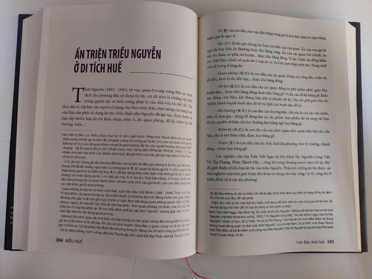 - Phụ lục: Shipouyaki Nhật Bản ở Bruxelles và pháp lam Huế ở Tokyo Ấn triện triều Nguyễn ở di tích Huế Biên chung, biên khánh, bác chung, đặc khánh ở Bảo tàng CVCĐ Huế Đồ ngự dụng xứ Huế Hoành phi câu đối trong ngôi nhà Huế Ngự viên thời Nguyễn và tranh gương cung đình Huế Vũ hội áo dài trên bức trấn phong xưa Tranh tường An Định Cung: nhiều câu hỏi lớn chưa lời đáp! Những bộ đầu hồ xưa Hai bộ xăm hường ở Huế xưa Tranh làng Sình Xe kiệu thời Nguyễn Xem bảo vật hoàng cung triều Nguyễn tại Bảo tàng CVCĐ Huế Cổ vật triều Nguyễn ở nước ngoài (*)