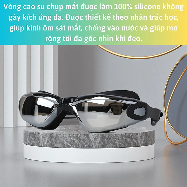 - Vòng cao su chụp mắt được làm 100% silicone không gây kích ứng da. Được thiết kế theo nhân trắc học, giúp kính ôm sát mắt, chống vào nước và giúp mở rộng tối đa góc nhìn khi đeo.