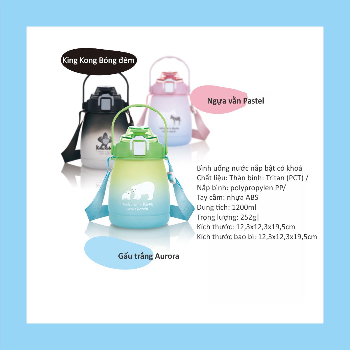 * Thương hiệu: KU.KU Duckbill * Xuất xứ: Đài Loan; Nhà máy sản xuất: Trung Quốc * Chất liệu: - Thân bình: PCT (Tritan) (chịu nhiệt 100 độ C) - Tay cầm: nhựa ABS (chịu