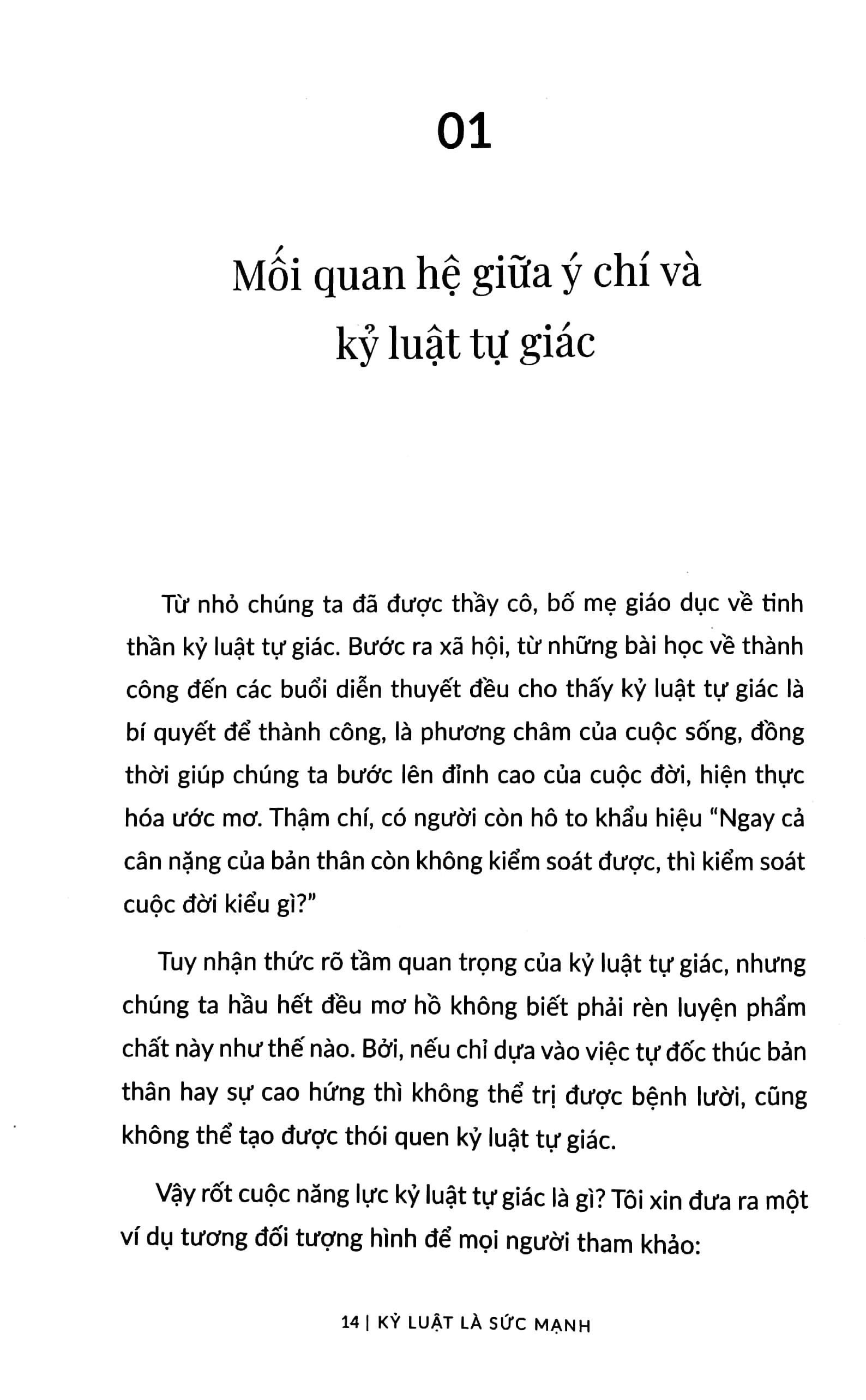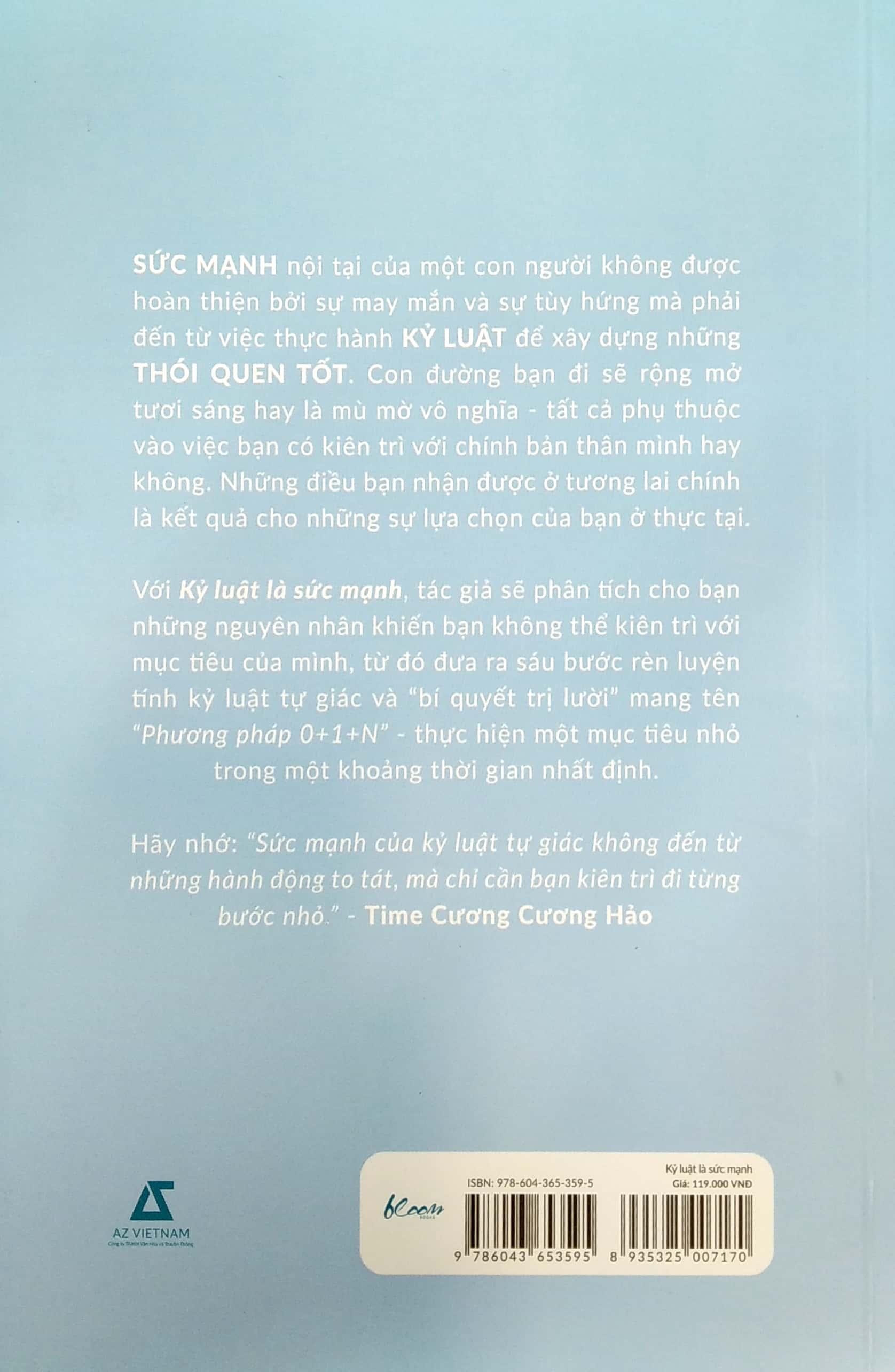 Với cuốn sách Kỷ luật là sức mạnh, tác giả sẽ phân tích cho bạn những nguyên nhân khiến bạn không thể kiên trì với mục tiêu của mình, từ đó đưa ra sáu bước rèn luyện tính kỷ luật tự giác và “bí quyết trị lười” mang tên “Phương pháp 0+1+N” - thực hiện một mục tiêu nhỏ trong một khoảng thời gian nhất định.