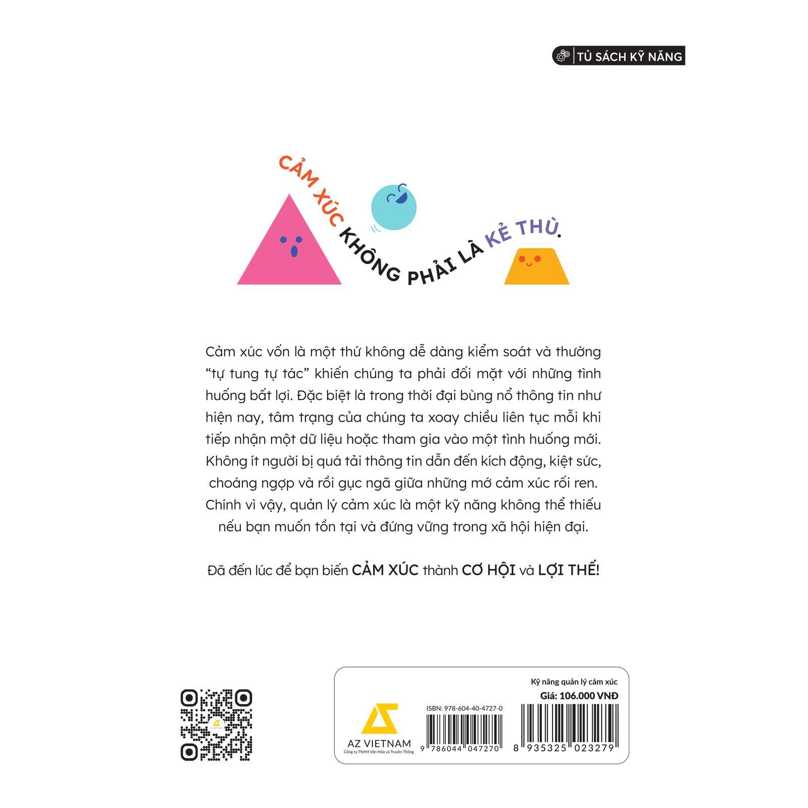 Nhà tâm lý học và triết gia người Mỹ William James từng nói: “Hành động tưởng chừng đi sau cảm xúc, nhưng thực ra hành động và cảm xúc đi cùng nhau; và bằng cách điều chỉnh hành động, thứ mà ý chí có thể trực tiếp điều khiển, chúng ta có thể gián tiếp điều chỉnh cảm xúc, thứ mà ý chí không thể.” Xuất phát từ quan điểm này, tác giả Khánh Ca - người sở hữu nhiều bài viết với hàng nghìn lượng chia sẻ trên các diễn đàn Trung, đã đưa ra bộ lời khuyên đề cao tính hành động trong cuốn sách “KỸ NĂNG QUẢN LÝ CẢM XÚC” của mình. Thông qua những câu chuyện đời thực của rất nhiều cá nhân đã tìm ra cách hoàn thiện bản thân theo hướng tốt đẹp hơn, “KỸ NĂNG QUẢN LÝ CẢM XÚC” chính là cuốn sách giúp bạn tiến gần hơn đến cái đích: Có cho mình suy nghĩ khách quan, quyết định sáng suốt và hành động đúng đắn Hạn chế xung đột, mâu thuẫn trong công việc và cuộc sống Tạo ấn tượng tốt với đồng nghiệp, bạn bè và những người xung quanh Giảm thiểu nguy cơ mắc các bệnh lý về thể chất và tinh thần Bí quyết của sự chuyển hóa năng lượng tiêu cực thành tích cực không phải lúc nào cũng nằm ở bên trong mỗi chúng ta mà đôi khi một sự thay đổi nhỏ của ngoại cảnh hay một tác động vừa đủ của lời nói mới chính là thứ tạo nên sự thay đổi rõ rệt nhất. Và cuốn sách này sẽ hướng dẫn bạn làm điều đó. Với “KỸ NĂNG QUẢN LÝ CẢM XÚC”, bạn có thể tin rằng những kiến thức và lời khuyên trong sách sẽ khiến bản thân bạn tốt lên từng ngày theo cách đến chính bạn cũng phải ngạc nhiên.