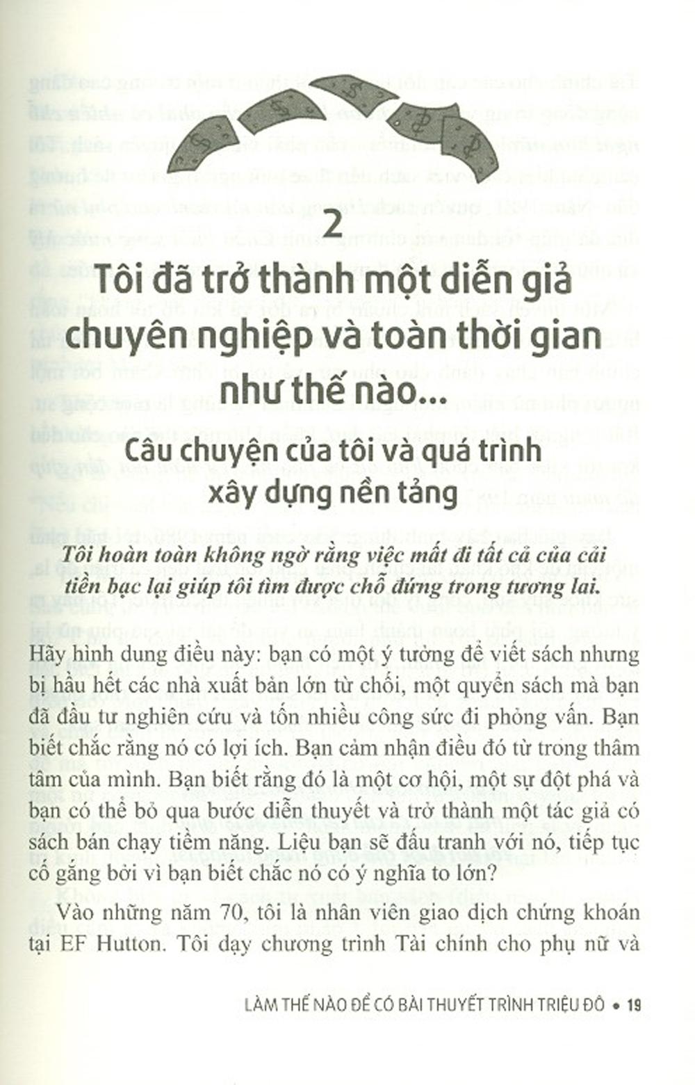 Nếu bạn từng muốn trở thành một chuyên gia về nghệ thuật thuyết trình, bạn phải mua quyền Làm thế nào để có bài thuyết trình triệu đô của Judith Briles. Nội dung, chiến lược, và phương pháp của cô chính là bí quyết cho việc nói chuyện thành công. Một tác giả có sách bán chạy, rất thành công của New York Times, một thiên tài xây dựng AuthorYOU và là diễn giả xuất chúng, Judith không "học" quá trình mà cô ta sống với nó. Trong quyền sách này, cô ta chia sẻ cách biến những cơn ác mộng trở thành những bài nói chuyện thăng hoa, nếu bạn đi theo hành trình này, bạn cũng có thể làm được. Giá như tôi có quyển sách này khi mới bắt đầu công việc diễn thuyết của m.ình,