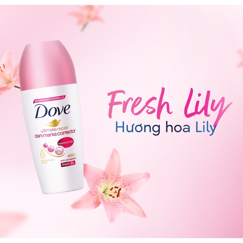 - Lăn Khử Mùi Dove Ultimate Repair Antiperspirant Sáng Da Mờ Thâm Hương Fresh Lily 40ml chứa 1/4 kem dưỡng ẩm và Vitamin B3 không chỉ giúp khắc phục các vết thâm mà còn sửa chữa các tổn thương trên da, giúp phục hồi rõ rệt vùng da dưới cánh tay săn chắc, mịn màng.