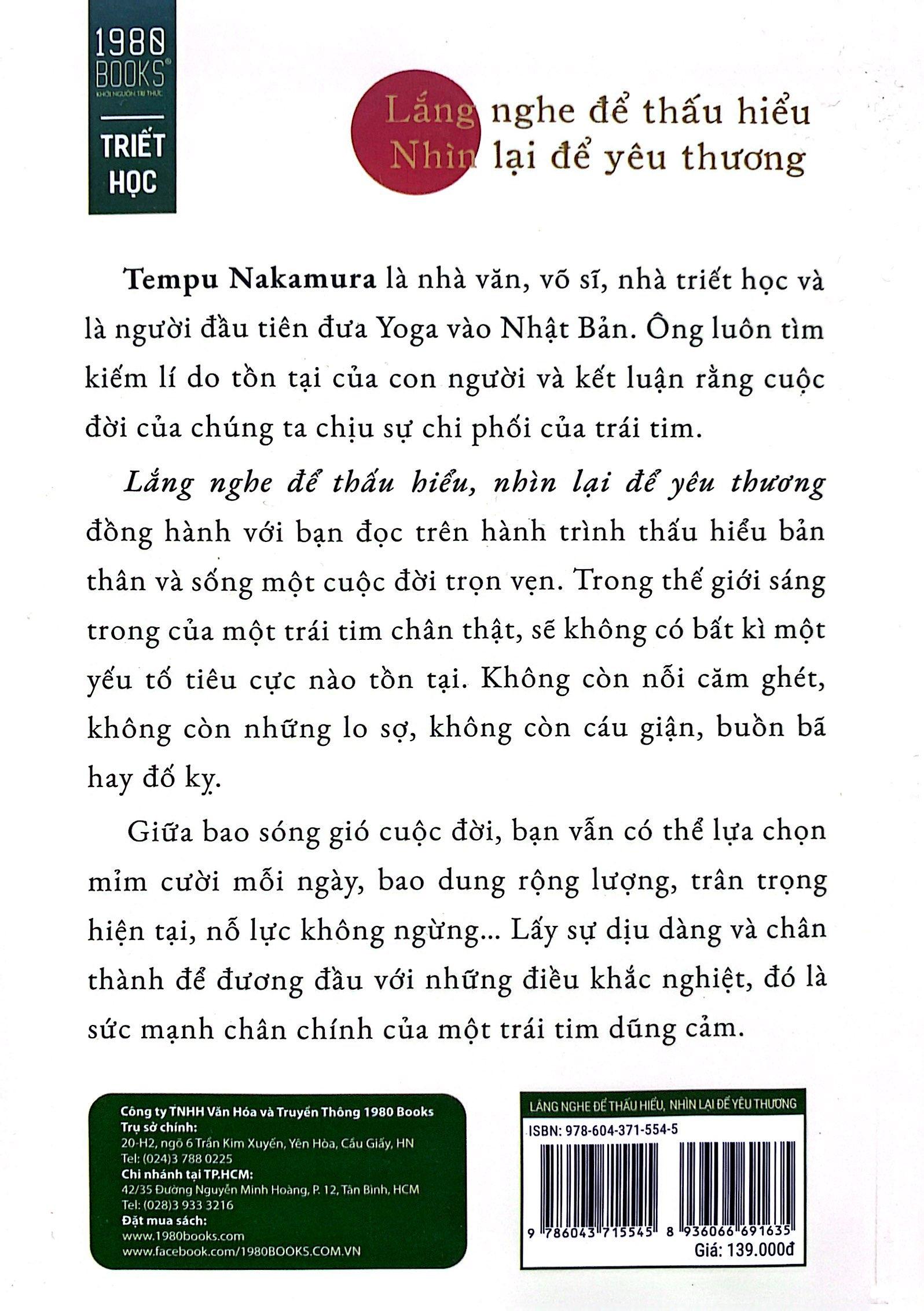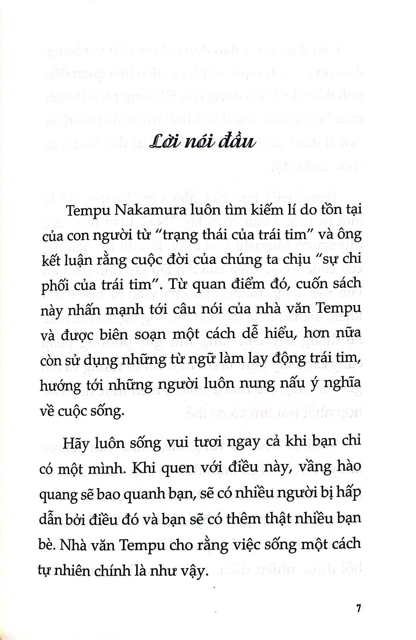 Tác giả Tempu Nakamura luôn tìm kiếm lí do tồn tại của con người từ “trạng thái của trái tim” và ông kết luận rằng cuộc đời của chúng ta chịu “sự chi phối của trái tim”. Từ quan điểm đó, cuốn sách “Lắng nghe để thấu hiểu, nhìn lại để yêu thương” này nhấn mạnh tới câu nói của nhà văn Tempu và được biên soạn một cách dễ hiểu, hơn nữa còn sử dụng những từ ngữ làm lay động trái tim, hướng tới những người luôn nung nấu ý nghĩa về cuộc sống. Hãy luôn sống vui tươi ngay cả khi bạn chỉ có một mình. Khi quen với điều này, vầng hào quang sẽ bao quanh bạn, sẽ có nhiều người bị hấp dẫn bởi điều đó và bạn sẽ có thêm thật nhiều bạn bè. Nhà văn Tempu cho rằng việc sống một cách tự nhiên chính là như vậy.