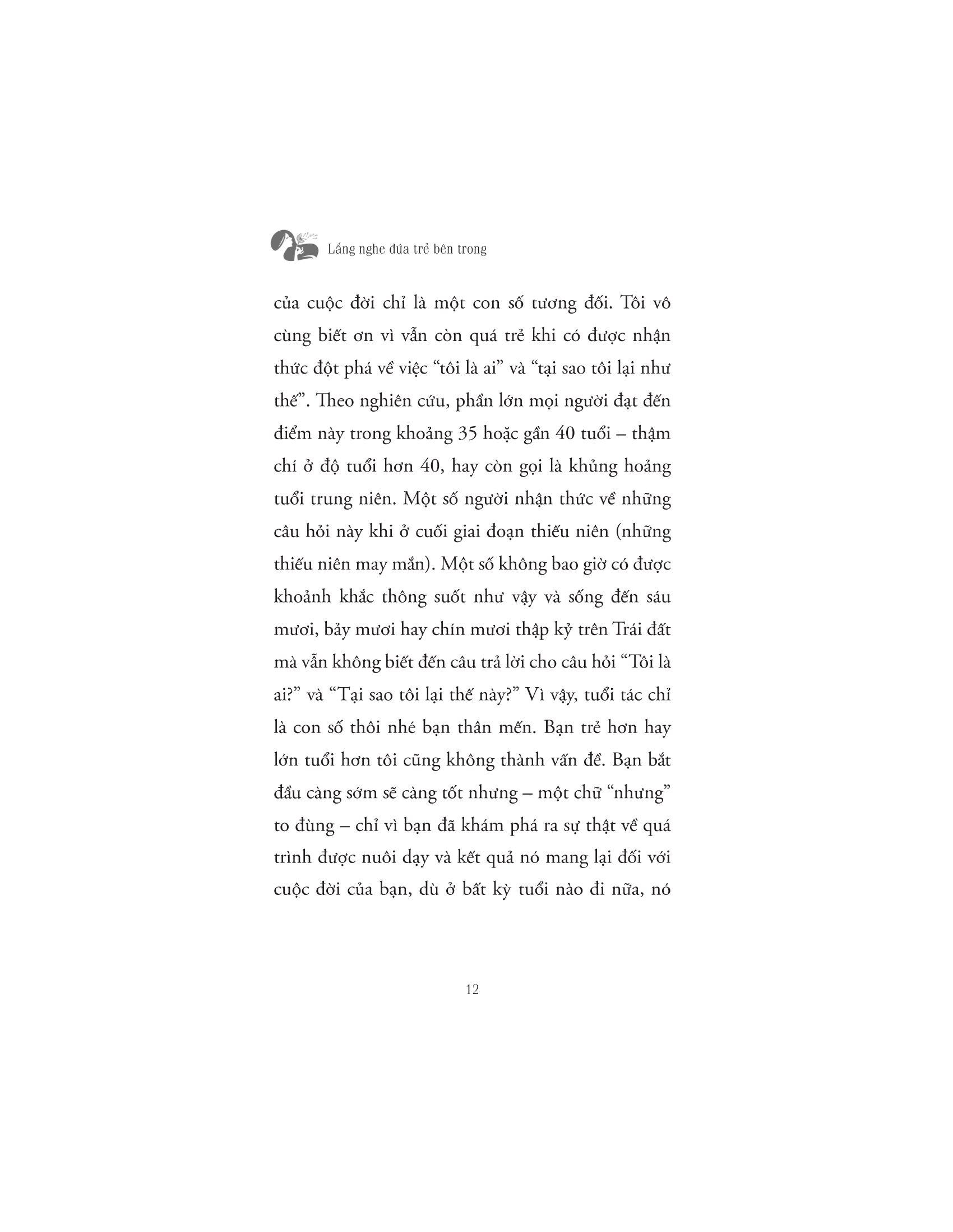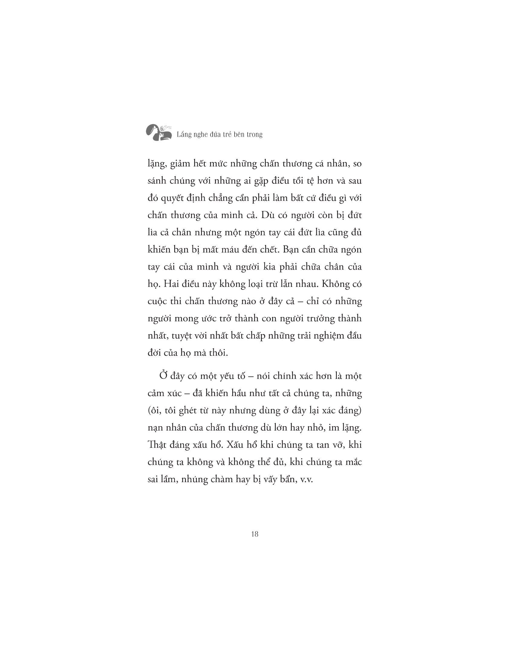 Và những tổn thương ấy đều không có vết sẹo nào chảy máu cả. Dẫu vậy nó vẫn đề lại trong tâm trí mỗi người một nét vẽ nghệch ngoạc. Cuốn sách “Lắng nghe đứa trẻ bên trong bạn” sẽ giúp bạn thấu hiểu cảm xúc, quay về với chính m.ình để yêu thương và chữa lành. Cuốn sách nhấn mạnh giá trị thực sự của bản thân bạn, học hỏi những kỹ năng để trở nên tự tin, cải thiện các mối quan hệ và cởi bỏ sự non nớt về mặc cảm xúc. Cuộc đời này là của bạn, vì thế đừng cầm bản đồ của người khác để dò đường đi của m.ình. Bạn có quyền quyết định cách bạn muốn sống. Hãy tìm ra sự can đảm của m.ình. Hãy sống một cách đích thực. Hãy bảo vệ bản thân và những gì quan trọng với bạn. Hãy phá kén, tỏa sáng theo cách riêng của m.ình. Khi chúng ta hành động dựa trên tiền đề của nhận thức và hành động dựa trên những giá trị tốt nhất của bản thân mình (thay vì nỗi sợ hãi, lo lắng và thiếu sót), chúng ta sẽ làm chủ vận mệnh của mình. Bởi chúng ta có quyền kiểm soát nó.