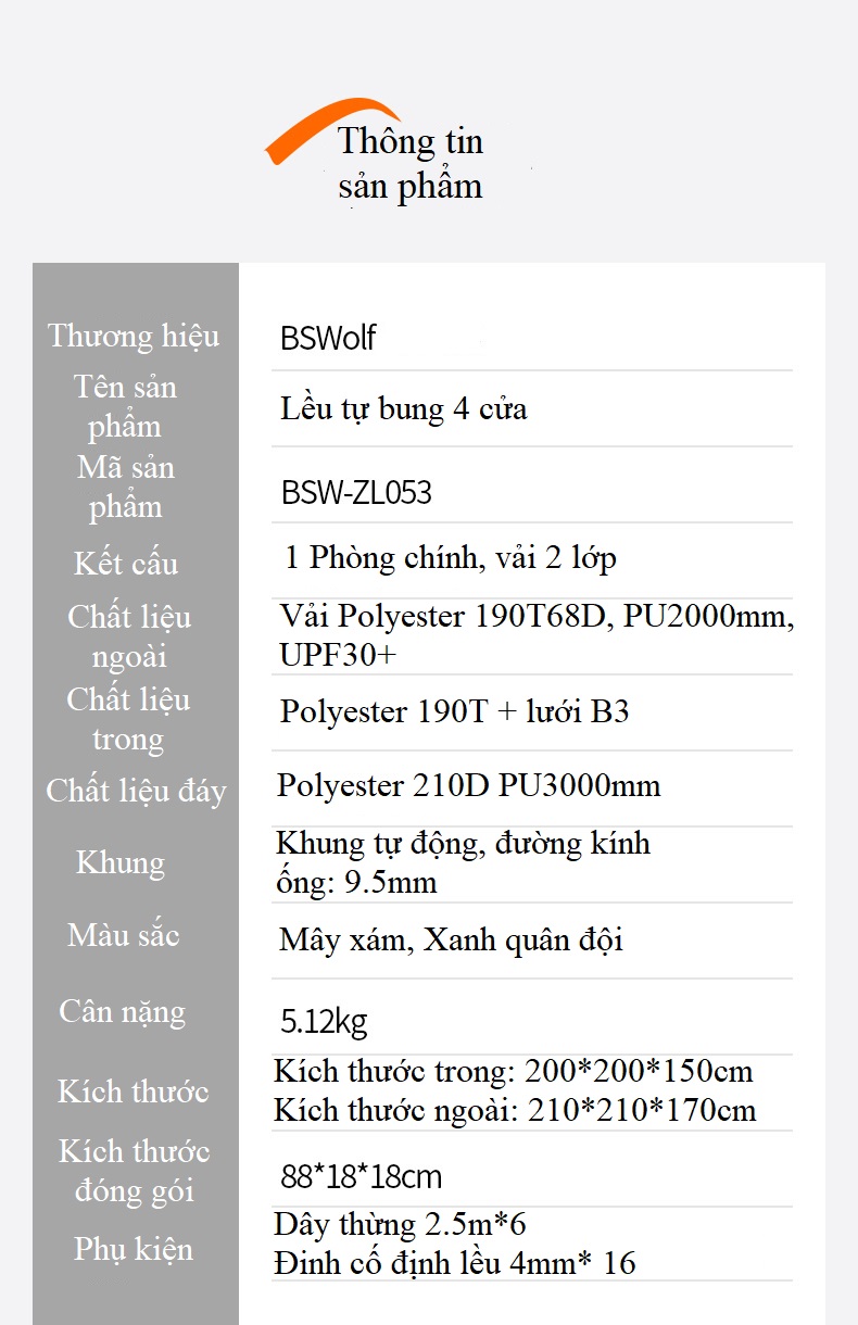 – Kích thước lều lớn, không gian rộng rãi thoải mái cho 4-6 người sử dụng.