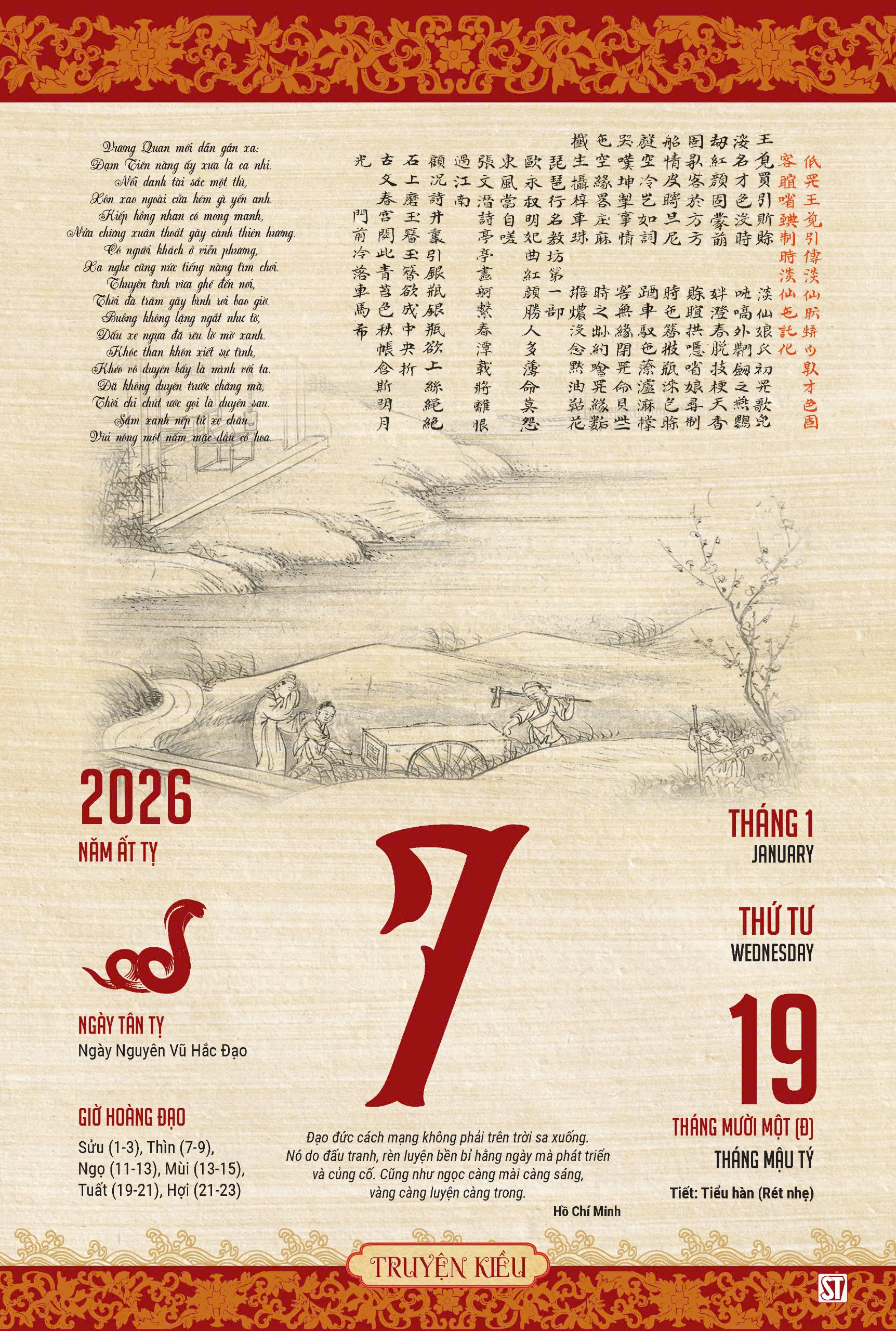 Lịch Bloc Truyện Kiều 2026: Tinh Hoa Văn Học Việt Nam Lịch bloc "Truyện Kiều" phiên bản 2026 là một sản phẩm văn hóa độc đáo, kết hợp giữa lịch truyền thống và giá trị bất hủ của kiệt tác "Truyện Kiều" của Đại thi hào Nguyễn Du (1765-1820). Phiên bản lịch này được xây dựng dựa trên bản gốc Kiều cổ, mà cụ thể là bản Kiều Vấn Tân truyền hiện đang được lưu giữ tại Thư viện nước Anh (The British Library). Đây là nguồn Kiều gốc từ Huế, được xem là có tính chất độc bản, từng được khắc công phu với phần chữ Hán Nôm và đặc biệt là tranh minh họa giàu tính tượng trưng và triết lý. Mỗi trang lịch không chỉ cung cấp thông tin ngày tháng mà còn là một tác phẩm nghệ thuật thu nhỏ, hiện đại hóa hình ảnh nguyên gốc Kiều chép tay của Hoàng gia triều Nguyễn. Lịch Truyện Kiều 2026 không chỉ là vật dụng xem ngày mà còn là một công trình văn hóa, giúp độc giả chiêm ngưỡng và tìm hiểu về các điển tích, hình ảnh gắn liền với thời đại Nguyễn Du – Danh nhân văn hóa thế giới. Sản phẩm này là món quà tinh tế, trang trọng, làm đẹp không gian sống và tôn vinh những giá trị văn hóa truyền thống của Việt Nam.