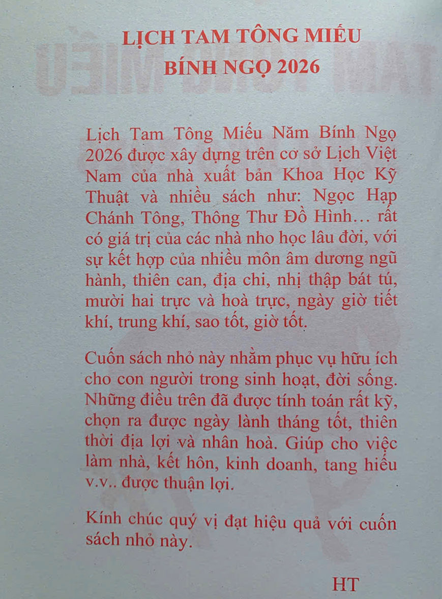 sách Lịch dùng trong 1 năm Bính Ngọ 2026 Lịch Tam Tông Miếu là bộ lịch phát triển dựa theo vũ trụ quan và những triết lý tốt đẹp trong cuộc sống hàng ngày. Nội dung của