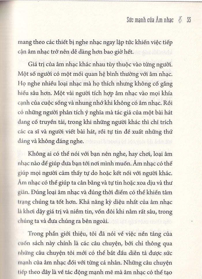 Một cách bản năng, chúng ta đều biết âm nhạc có sức ảnh hưởng rất lớn, ở nó có gì đó thật kỳ diệu. Khi nghe bài hát đúng tâm trạng, bạn sẽ khóc hoặc cười, gõ nhịp chân hoặc chỉ thở ra mãn nguyện “à”. Âm nhạc kết nối tới thứ gì đó sâu thẳm trong chúng ta, thứ gì đó liên quan đến khả năng sáng tạo ra mọi điều ta khao khát. Tôi đang không chỉ nói về hội họa, âm nhạc hay văn chương, mà mọi sự sáng tạo của cuộc sống – làm ra một chiếc bánh hoặc dọn sạch một khu vực trong nhà bạn, hay thậm chí chỉ là tạo ra một cảm xúc, tốt hoặc xấu. Âm nhạc mang đến cho chúng ta một đường dẫn trực tiếp tới sức mạnh đó và giúp nó nở rộ theo cách gần như không thể lý giải được. Tôi đã nghe nói về thuật ngữ “liệu pháp âm nhạc” cách đây ít lâu, nhưng chưa bao giờ thực sự chú ý, thành thật mà nói, thậm chí còn gạt nó đi vì từ “liệu pháp” (làm thế nào một thứ tuyệt vời như âm nhạc lại bị quy thành liệu pháp – như phân tâm học hay gì đó). Sau đấy, tôi đã gặp Jennifer Buchanan. Cô là một chuyên gia trị liệu âm nhạc được đào tạo, nhưng có điều gì đó ở Jennifer khiến tôi ngay lập tức nghiêm túc chú ý. Trước cô, chưa từng có ai nói với tôi những điều như vậy về âm nhạc. Gần với những điều “không thể lý giải nổi” mà tôi luôn biết có tồn tại trong âm nhạc nhưng chưa bao giờ thật sự nắm bắt được. Rõ ràng là Jennifer ấp ủ một cuốn sách và nóng lòng được xuất bản nó. Tôi chưa đọc cuốn sách nào về “liệu pháp âm nhạc”, nhưng tôi có thể nói rằng cô ấy đang cố gắng mang đến thứ gì đó chưa từng được trình bày đầy đủ trên giấy. Tôi nói với cô ấy rằng khoa học về âm nhạc không phải là điều khiến chủ đề này hấp dẫn tôi. Khi cô ấy bắt đầu kể cho tôi nghe các câu chuyện của mình, tôi biết rằng những câu chuyện đó đã hàm chứa câu trả lời: đó là những gì âm nhạc có thể làm với một người đang cần được cổ vũ, giảm căng thẳng, hay thậm chí đang tìm cách kết nối trở lại với thế giới. Bốn năm đã trôi qua kể từ lần đầu tiên tôi gặp Jennifer và hai năm kể từ khi chúng tôi xuất bản ấn phẩm đầu tiên của cuốn sách này. Sau khi đọc một số bản nháp sơ bộ, tôi đã gợi ý cho cô về cách làm nổi bật thông điệp. Sau khi đọc cuốn sách của cô, tôi đã suy nghĩ rất nhiều về âm nhạc và việc không hiểu sao cuộc sống của tôi lại thiếu đi âm nhạc nhiều đến thế. Tôi yêu âm nhạc, tôi lớn lên với việc chơi piano.  Tôi có thể chọn bất kỳ nhạc cụ nào, trừ đàn guitar vì một vài lý do, và học chơi khá nhanh. Nhưng vài năm trước, tôi không còn nghe nhạc thường xuyên nữa. Tôi không còn bật radio trong xe hơi vì thích sự im lặng. Là một tác giả, đôi khi tôi tập trung hoàn toàn vào những suy nghĩ của mình. Tôi nói về việc “nghe” một cuốn sách trong đầu trước khi viết nó ra, vì vậy có thể nói rằng tôi “viết” liên tục, bất kể tôi đang làm  gì khác. Nhưng kể từ khi đọc bản nháp đầu tiên của cuốn sách này, tôi đã có chút áy náy với ý nghĩ mình không còn nghe nhạc nhiều như trước nữa, và chắc chắn tôi đã không nghe bất cứ thứ gì có thể chắp cánh cho mình. Tôi có một cô con gái đang học tiểu học nên chúng tôi thường xuyên nghe nhạc pop, nhưng các thể loại khác thì không nhiều lắm. Rồi một buổi sáng Chủ nhật, tôi từ cửa hàng tạp hóa trở về nhà. Người cha yêu dấu của tôi vừa qua đời khoảng ba tuần trước đó; tôi ngập ngụa trong công việc, và không hề vui vẻ – tôi chỉ làm việc nhà, đảm bảo gia đình mình được chăm sóc đầy đủ. Khi bước vào cửa, tôi nghe thấy chất giọng tuyệt vời của James Taylor đang hát “Sweet Baby James”. Chúng tôi có một cái máy nghe nhạc nhỏ trong bếp, không phải là đồ xịn gì và chồng tôi đã bật đĩa Những bài hát hay nhất của James Taylor mà anh tìm được tại một cửa hàng từ thiện ngày hôm trước. Khi nghe những giai điệu của bài hát đó, tôi đã suýt khóc. Đó là thứ hay nhất mà tôi được nghe trong suốt một thời gian dài. Vì bất cứ lý do gì, buổi sáng hôm đó, giai điệu ấy chính là âm nhạc “của tôi”, và thông điệp từ cuốn sách của Jennifer bừng lên trong tôi. Khi tôi cần một thứ gì đó êm dịu dễ chịu, thì nó đây: James Taylor đang hát cho tâm hồn tôi. Ngay lập tức tôi cảm thấy thư giãn hơn. Tôi bỏ túi đồ tạp hóa trên tay xuống và bắt chồng khiêu vũ với mình ngay giữa bếp. Sau suốt một thời gian dài tôi mới cảm thấy kết nối với cuộc sống nhiều đến thế. Đó là một kỷ niệm tôi sẽ trân trọng. “Ứng dụng âm nhạc để thay đổi cuộc sống” là cuốn sách về việc sử dụng âm nhạc có chủ đích. Bạn sẽ thấy rõ điều này hơn trong các trang tiếp theo, nhưng tôi chắc chắn, theo bản năng, bạn vốn đã biết điều đó nghĩa là gì rồi. Đó là việc tìm kiếm âm nhạc phù hợp cho bất kỳ tình huống nào: khi bạn