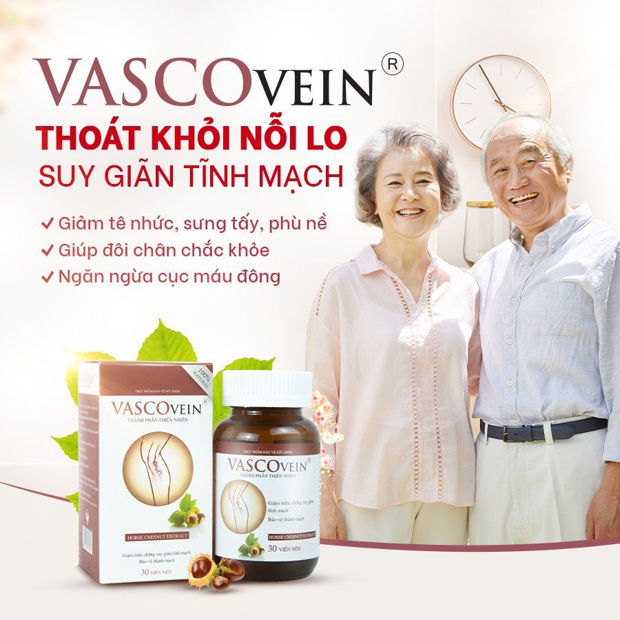 - VIÊN UỐNG HỖ TRỢ VÀ PHÒNG NGỪA SUY GIÃN TĨNH MẠCH VASCOVEIN Với sự kết hợp của các thành phần thiên nhiên như: chiết xuất Hạt dẻ ngựa, chiết xuất hoa Hòe, chiết xuất hạt Nho, Viên uống Vascovein giúp cung cấp các dưỡng chất làm tăng độ đàn hồi da và mạch máu, chống lão hóa, ngăn ngừa và cải thiện tình trạng suy giãn tĩnh mạch. Thành phần Viên uống Vascovein: