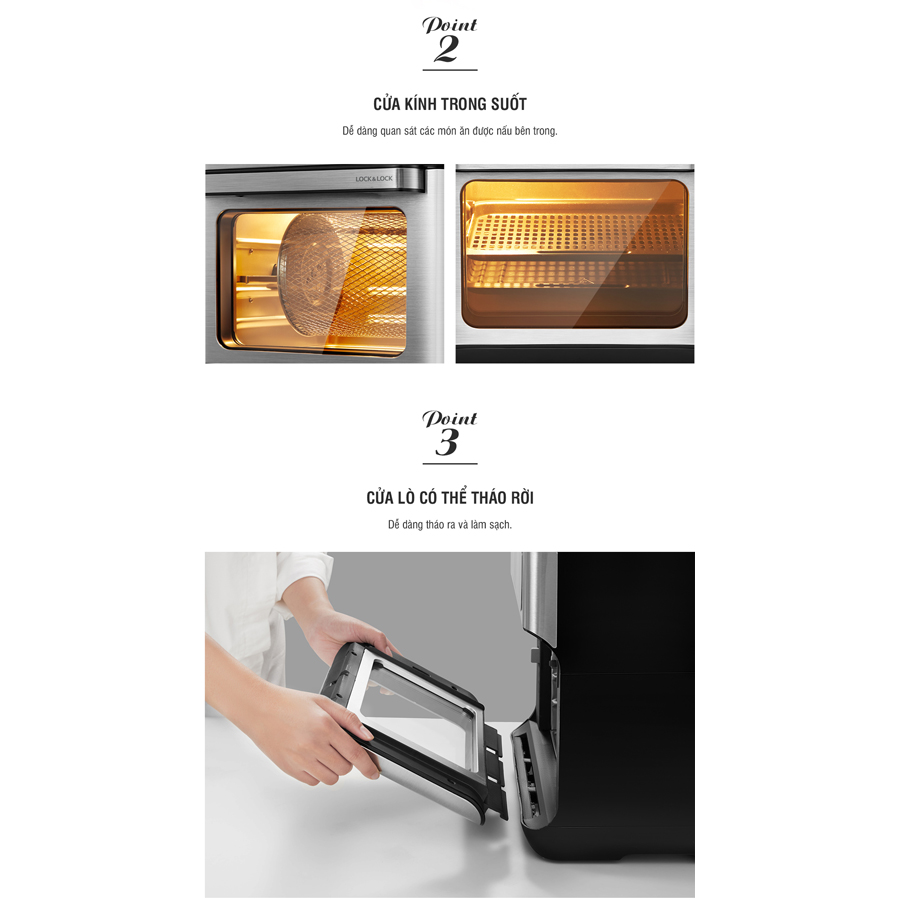 Lock&Lock EJF291BLK với dung tích 10L là lựa chọn tuyệt vời đối với những gia đình có ít thành viên, có thể sử dụng cho tất cả các loại thịt cá và rau củ. Các chức năng của lò được điều khiển dễ dàng thông qua núm vặn, rất phù hợp với những người mới bắt đầu sử dụng lò nướng hiện đại.
