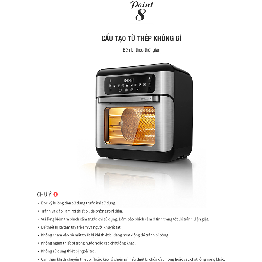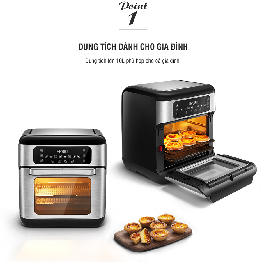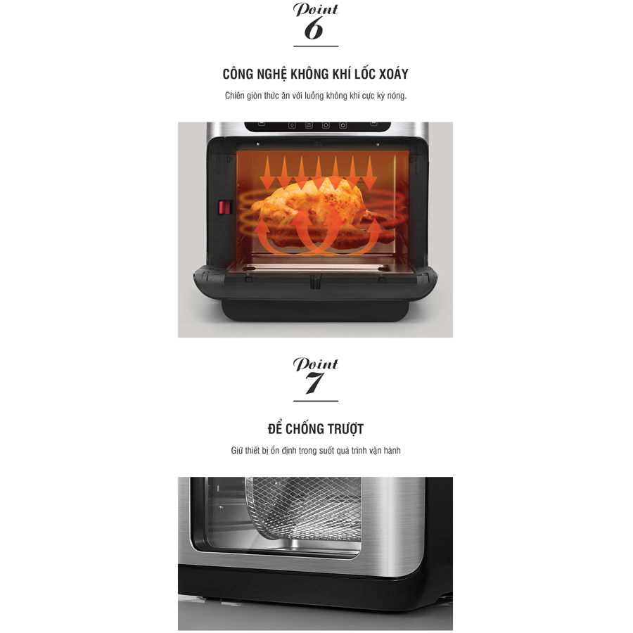 Sản phẩm làm chín thực phẩm bằng các luồng không khí lốc xoáy thay vì dầu nóng, giúp bạn chế biến món ăn lành mạnh hơn. Sản phẩm còn được trang bị bộ lọc mùi và khói. Là sự tổng hợp của nhiều thiết bị và dụng cụ nấu nướng, với bộ hẹn giờ kỹ thuật số được tích hợp chế độ tự động tắt.