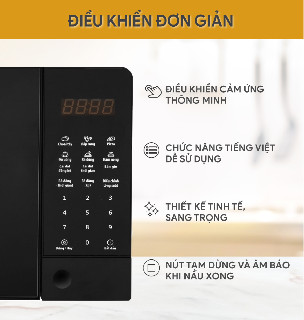 - Thiết kế Lò vi sóng có thiết kế trang nhã, nhỏ gọn phục vụ tốt nhu cầu sử dụng cá nhân hoặc gia đình ít người, có thể bỏ vừa gà nguyên con khoảng 1 kg, bên cạnh đó khoang lò bằng thép không gỉ an toàn cho sức khỏe. Bảng điều khiển cảm ứng bằng tiếng Việt dễ hiểu, dễ thao tác điều chỉnh. Bàn phím số từ 0 đến 9 sử dụng để điều chỉnh mức công suất, cài đặt thời gian nấu, cài đặt đồng hồ.