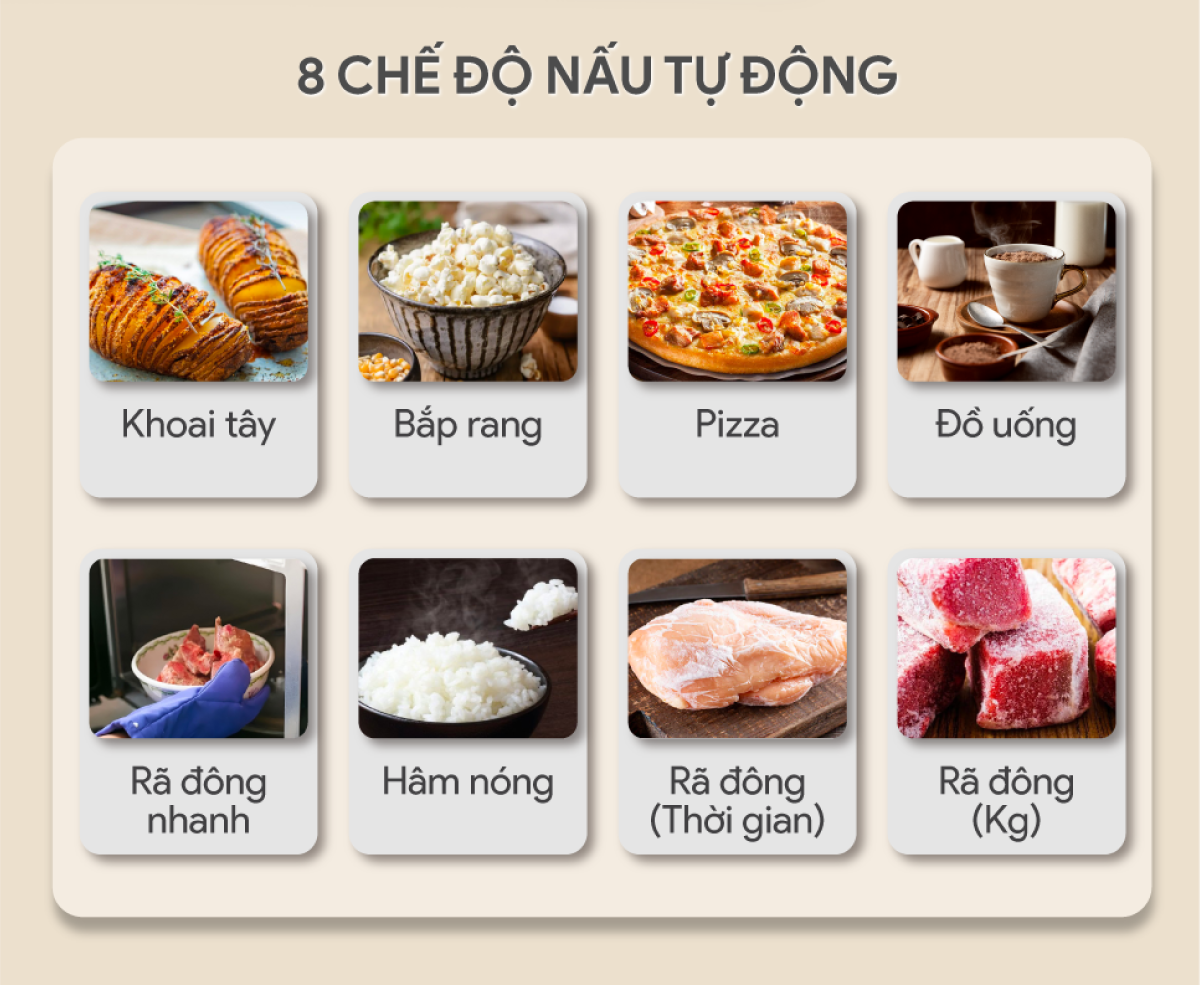 - Đa dạng chế độ nấu tự động, 8 menu tự động đã được cài đặt sẵn, mức công suất 1100W Cách sử dụng lò vi sóng đơn giản với nhiều chức năng như rã đông (theo thời gian, khối lượng), nướng, nướng kết hợp, hâm nóng và các menu có sẵn giúp chế biến nhanh chóng, tiết kiệm thời gian. Menu gợi ý sẵn bao gồm các món ăn đa dạng như bắp rang, pizza, đồ uống, rã đông, hâm nóng, hoặc bạn có thể tùy chỉnh nhiệt độ, thời gian phù hợp với món ăn mà mình muốn chế biến sao cho phù hợp. Chỉ cần nhấn phím biểu tượng tương ứng với loại thực phẩm lò sẽ tự động nấu theo công thức mặc định mà không cần nhập tay thủ công, tiện lợi và đơn giản.